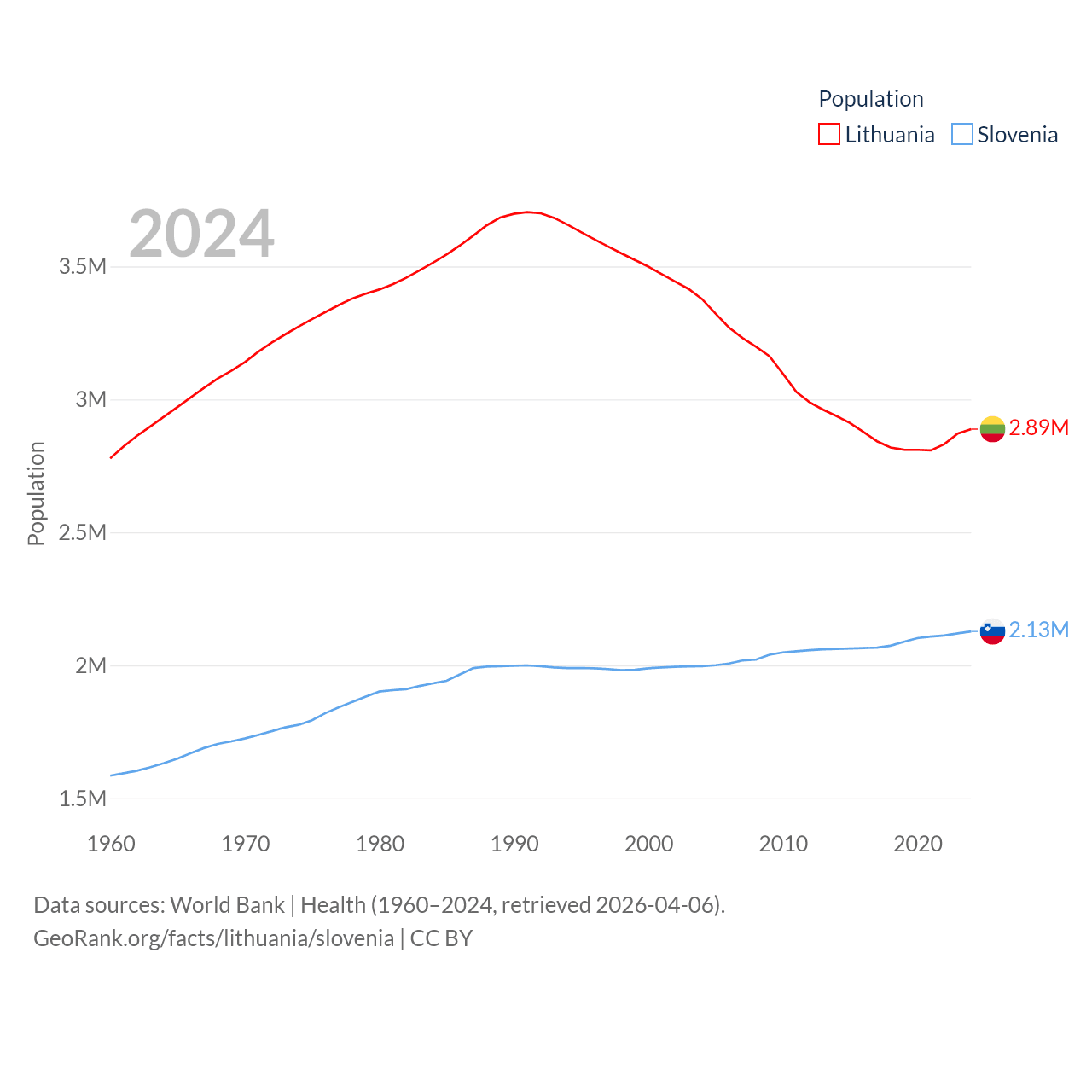 Lithuania has a population of 2.89M (ranked 137/197), compared with 2.13M in Slovenia (ranked 147/197). Lithuania's land area is 24,170 sq mi versus 7,774 sq mi for Slovenia (ranked 120th vs. 151st).