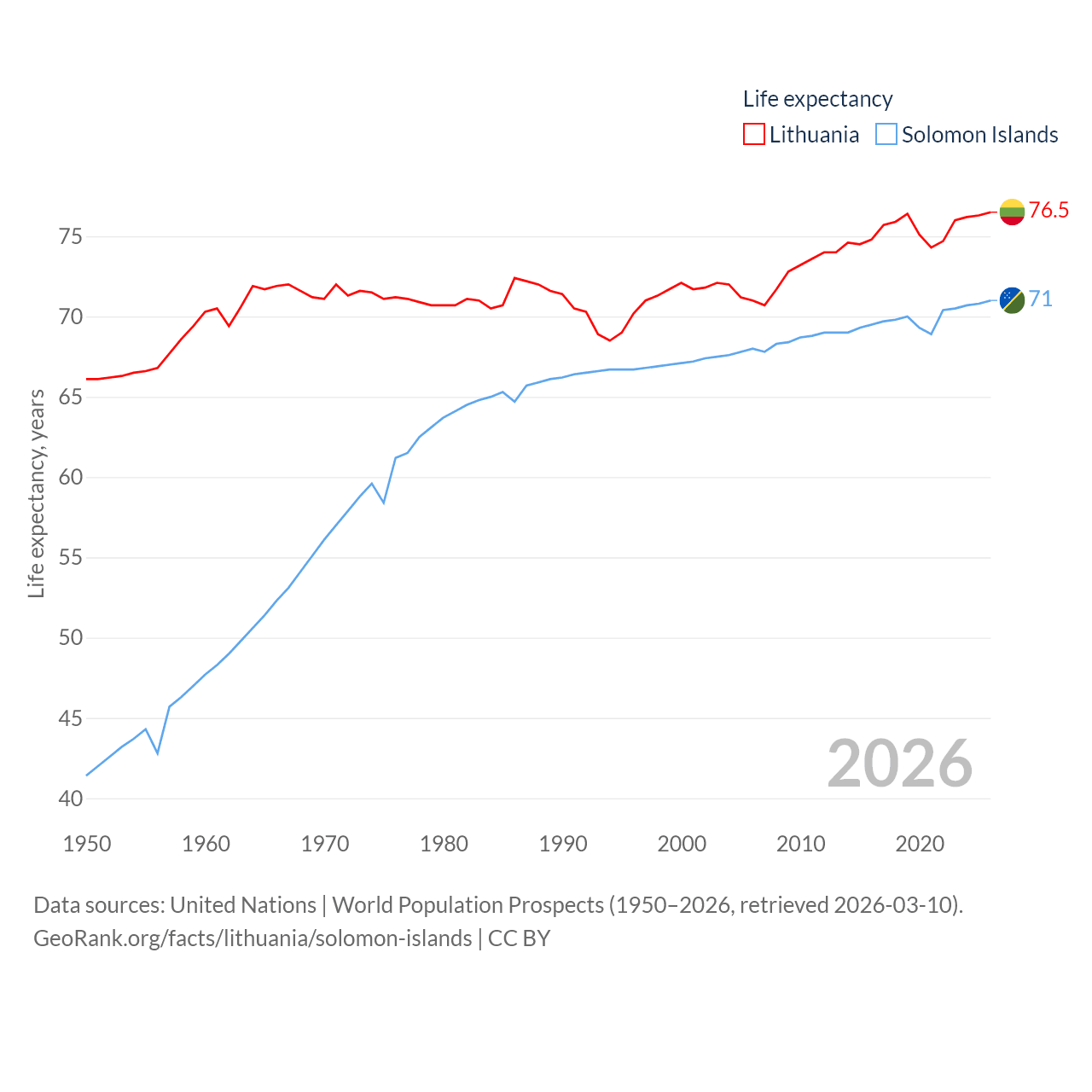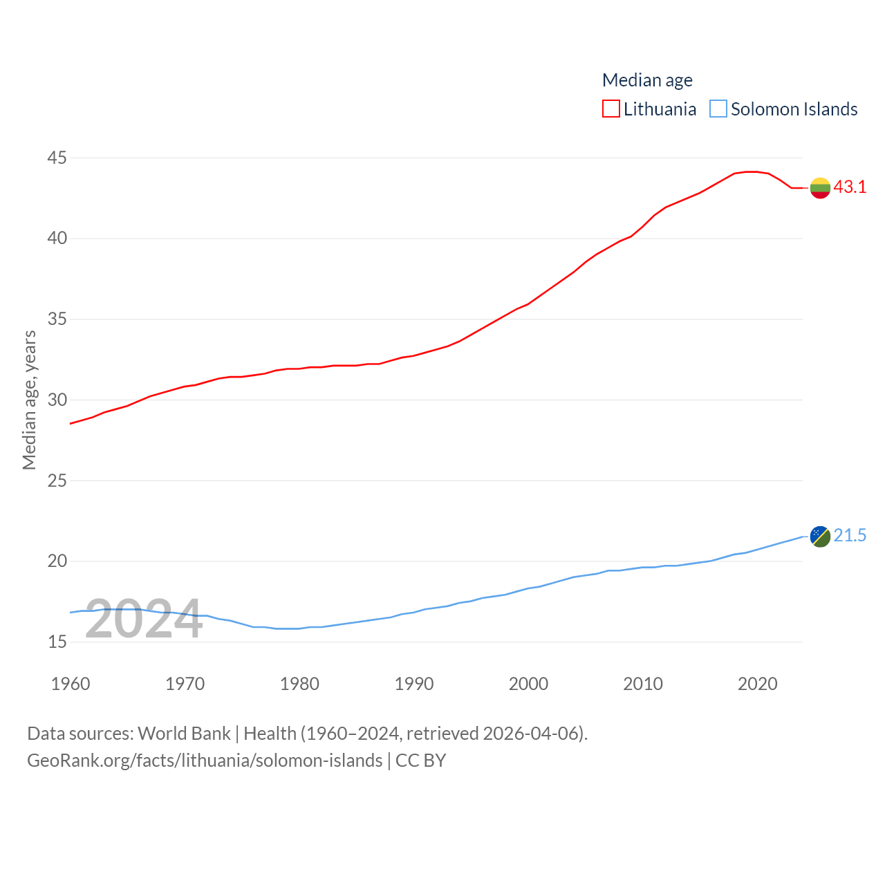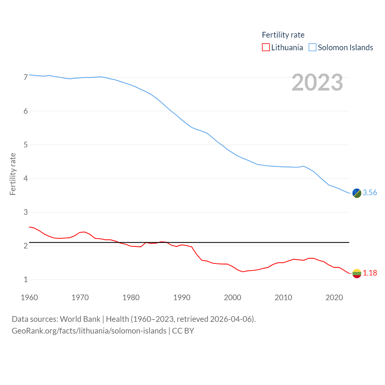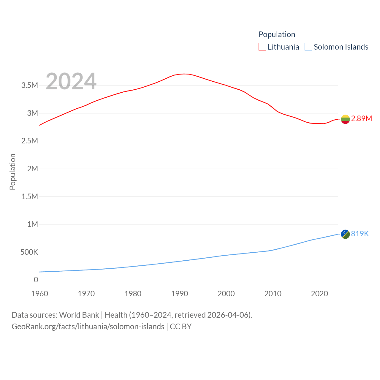Lithuania has a population of 2.89M (ranked 137/197), compared with 819K in The Solomon Islands (ranked 162/197). Lithuania's land area is 24,170 sq mi versus 10,807 sq mi for The Solomon Islands (ranked 120th vs. 141st).