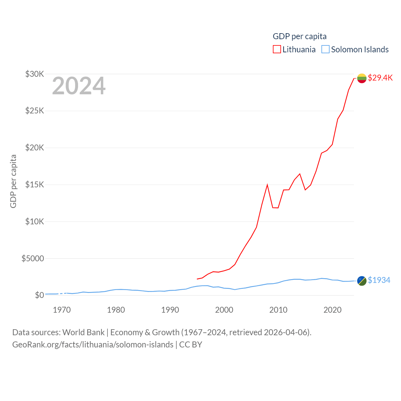 By GDP, Lithuania ranks 79/197 ($84.9B) and The Solomon Islands ranks 182/197 ($1.58B). By GDP per capita, Lithuania ranks 43/197 ($29,384), while The Solomon Islands ranks 157/197 ($1,934).