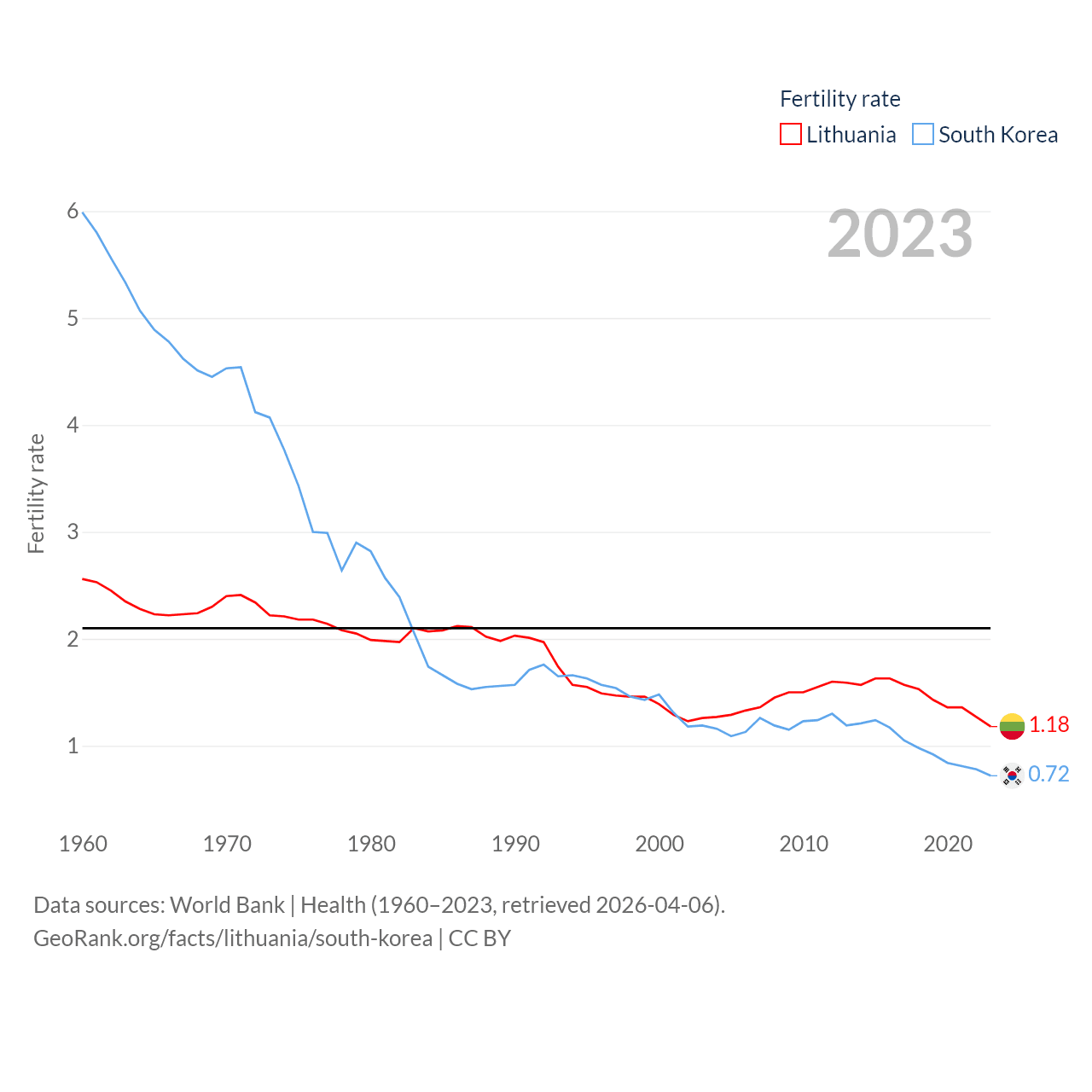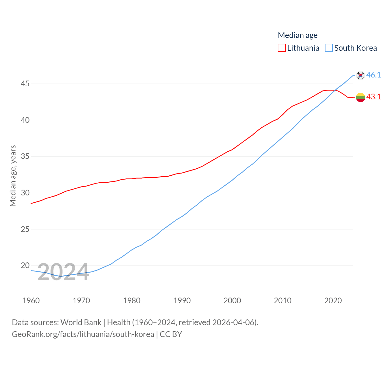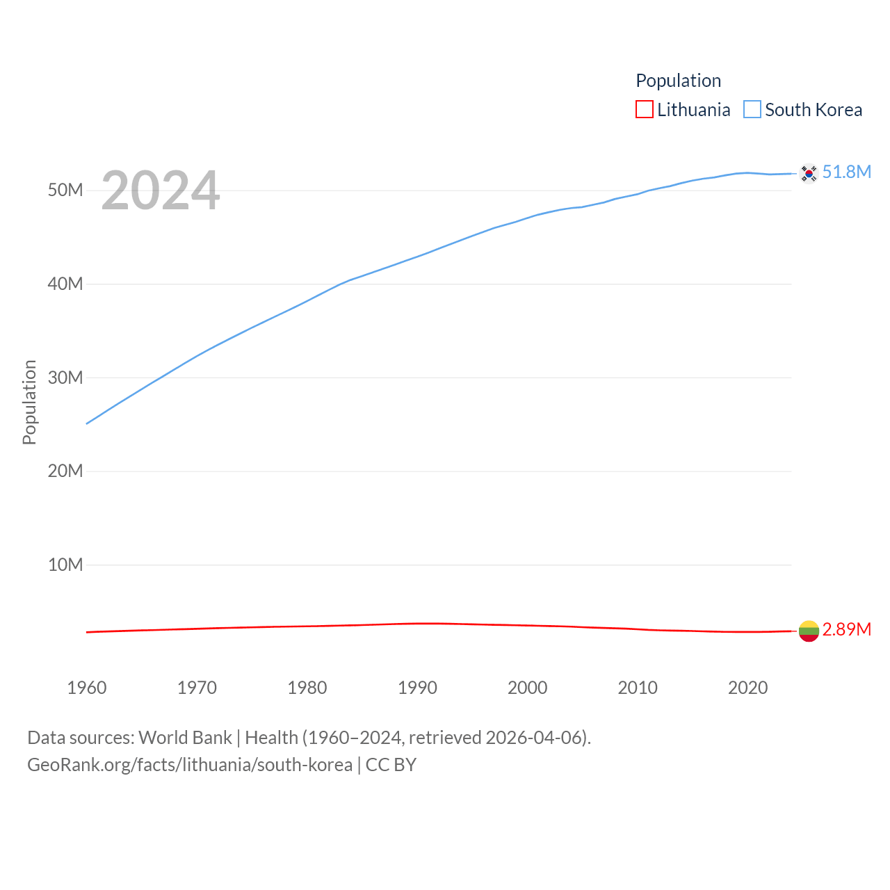 Lithuania has a population of 2.89M (ranked 137/197), compared with 51.8M in South Korea (ranked 29/197). Lithuania's land area is 24,170 sq mi versus 37,684 sq mi for South Korea (ranked 120th vs. 105th).