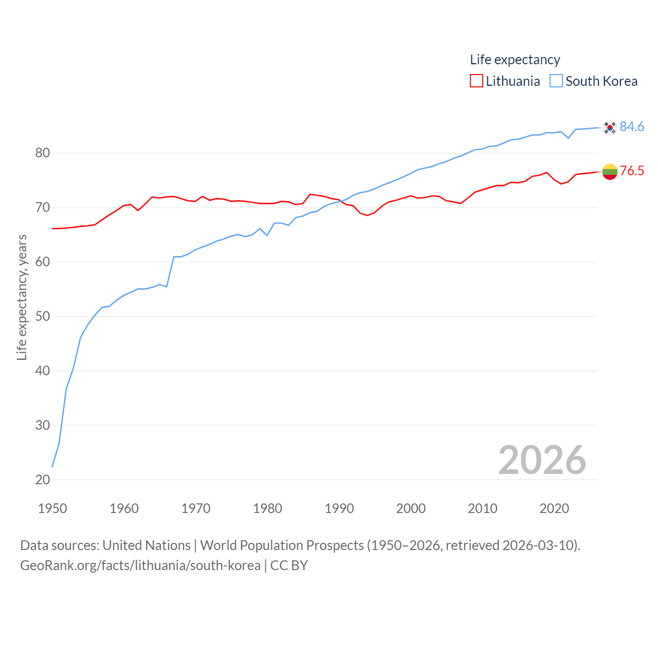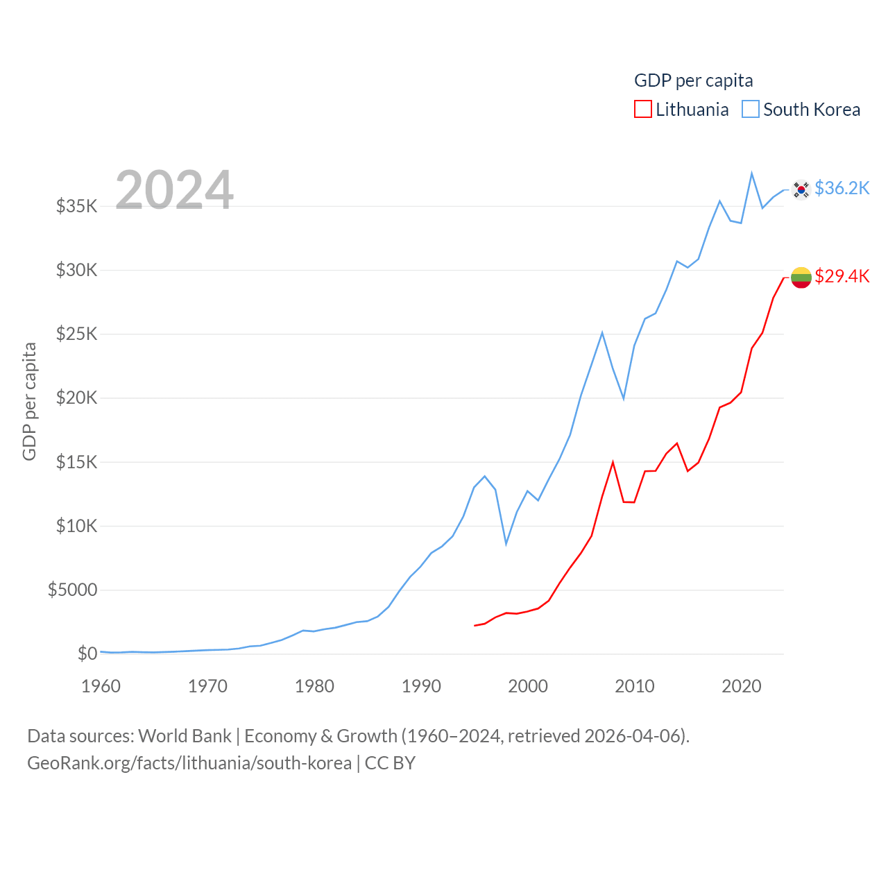 By GDP, Lithuania ranks 79/197 ($84.9B) and South Korea ranks 12/197 ($1.88T). By GDP per capita, Lithuania ranks 43/197 ($29,384), while South Korea ranks 31/197 ($36,239).