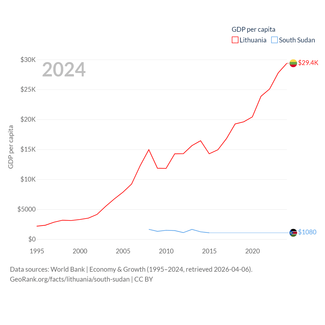 By GDP, Lithuania ranks 79/197 ($84.9B) and South Sudan ranks 149/197 ($12B). By GDP per capita, Lithuania ranks 43/197 ($29,384), while South Sudan ranks 175/197 ($1,080).