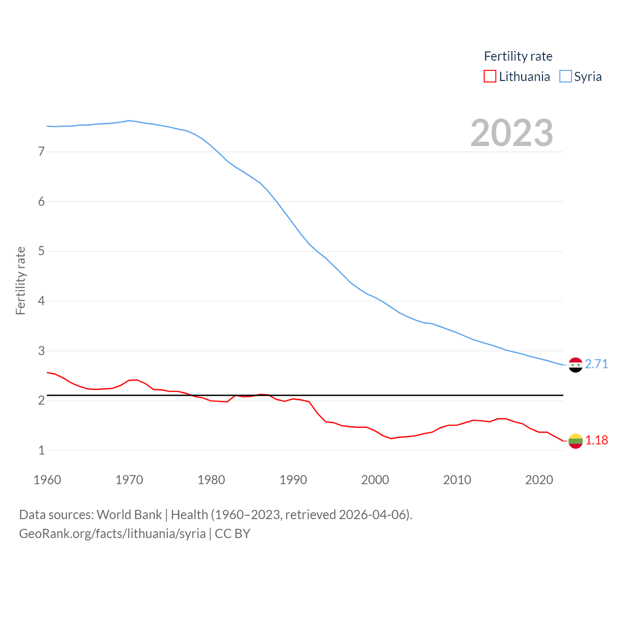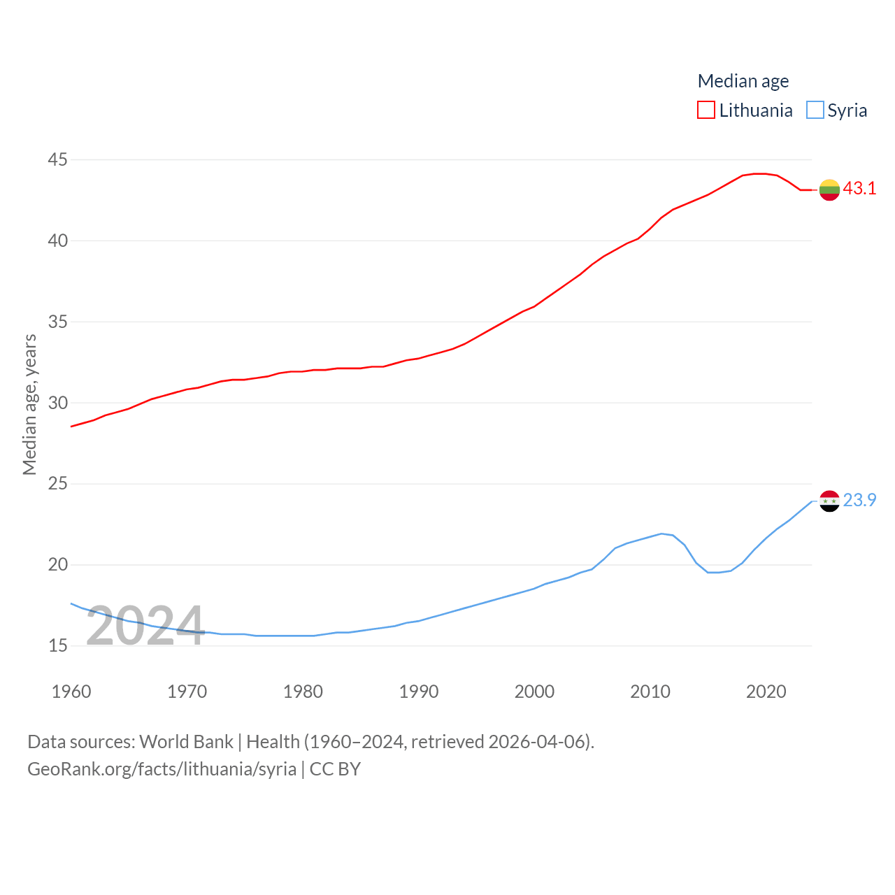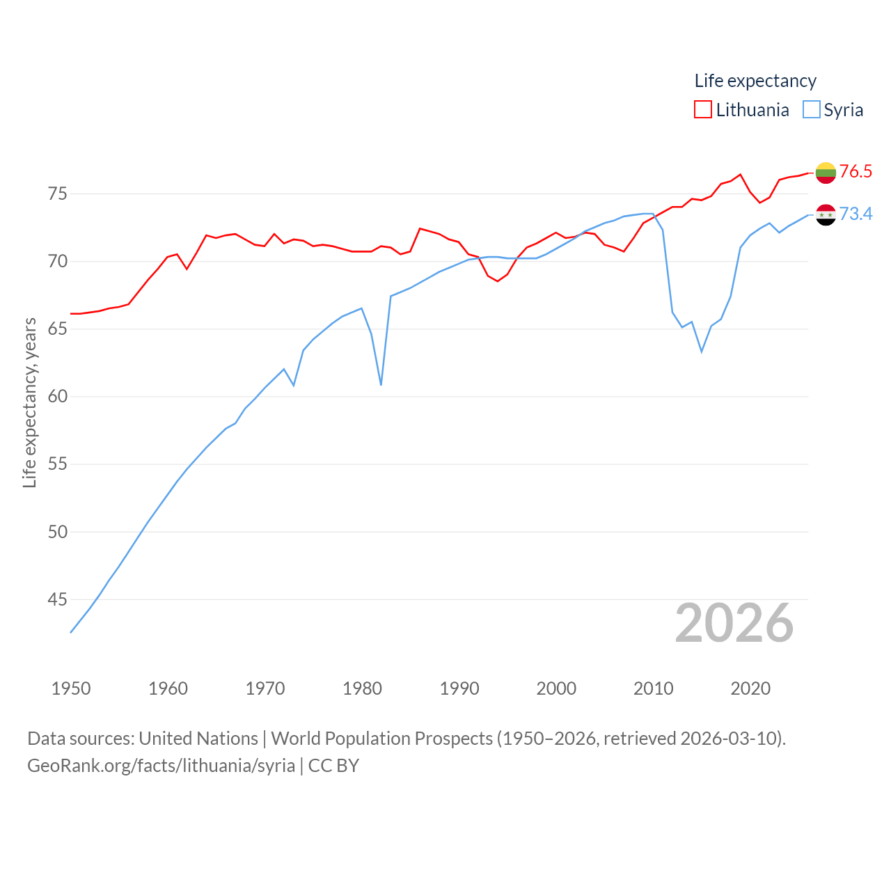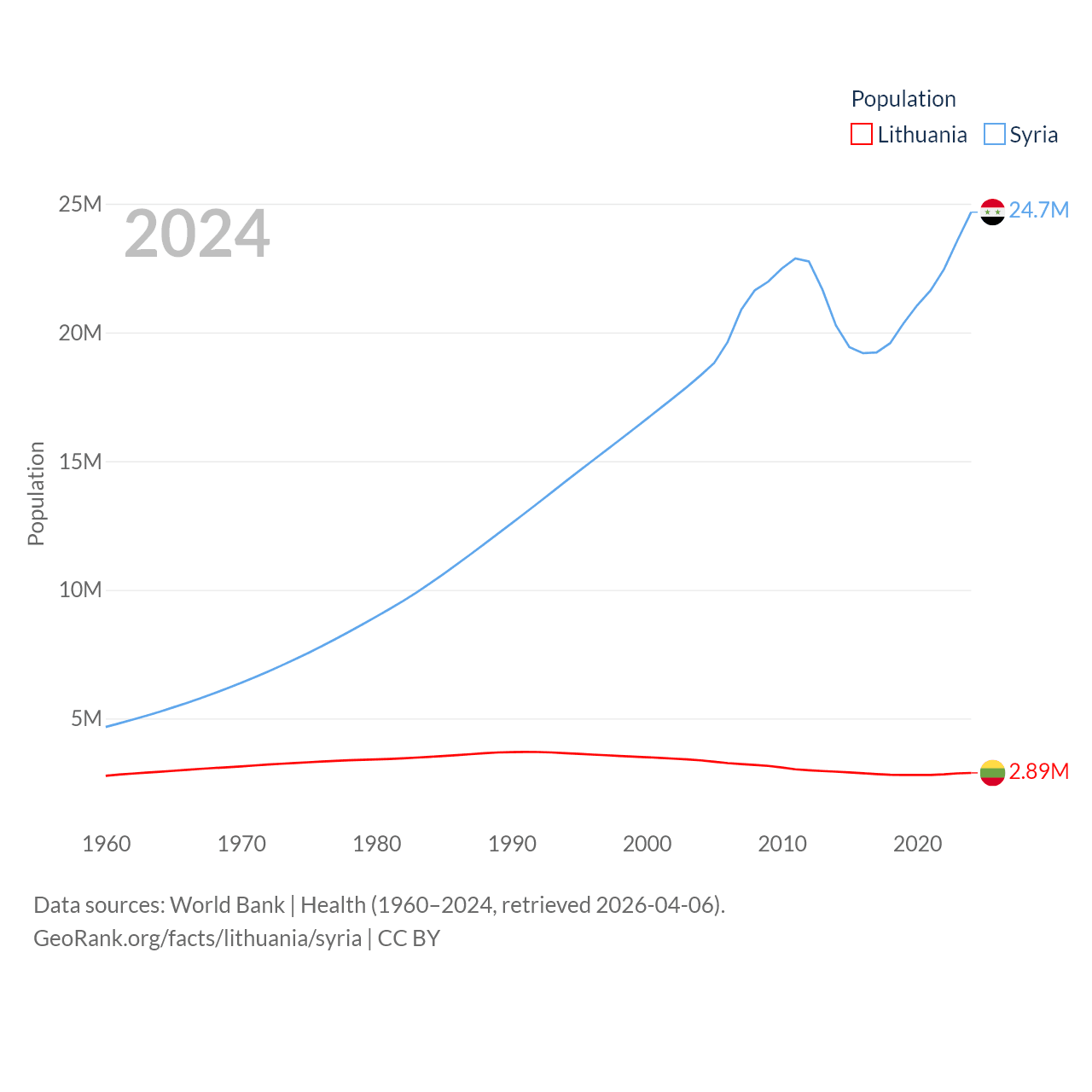 Lithuania has a population of 2.89M (ranked 137/197), compared with 24.7M in Syria (ranked 57/197). Lithuania's land area is 24,170 sq mi versus 70,900 sq mi for Syria (ranked 120th vs. 87th).