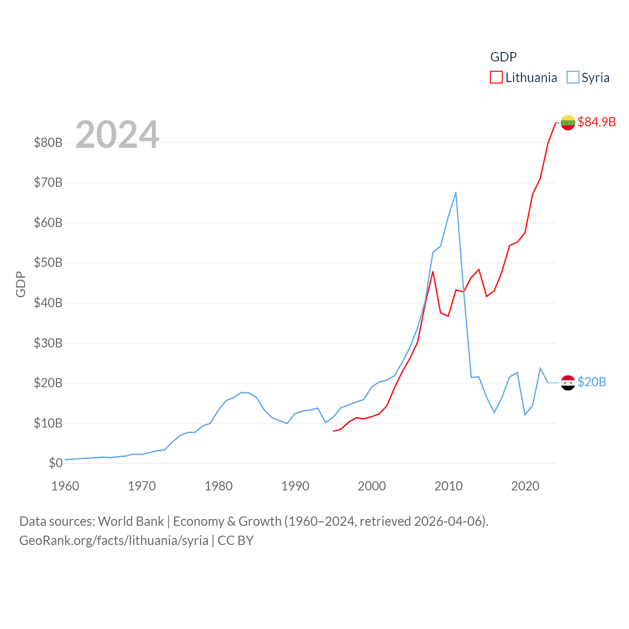 By GDP, Lithuania ranks 79/197 ($84.9B) and Syria ranks 129/197 ($20B). By GDP per capita, Lithuania ranks 43/197 ($29,384), while Syria ranks 185/197 ($847).