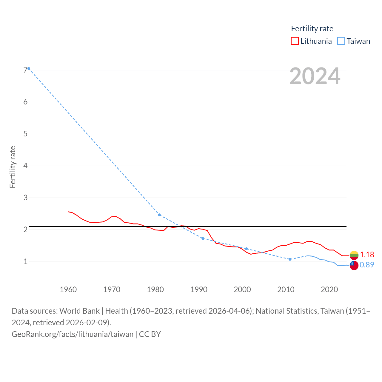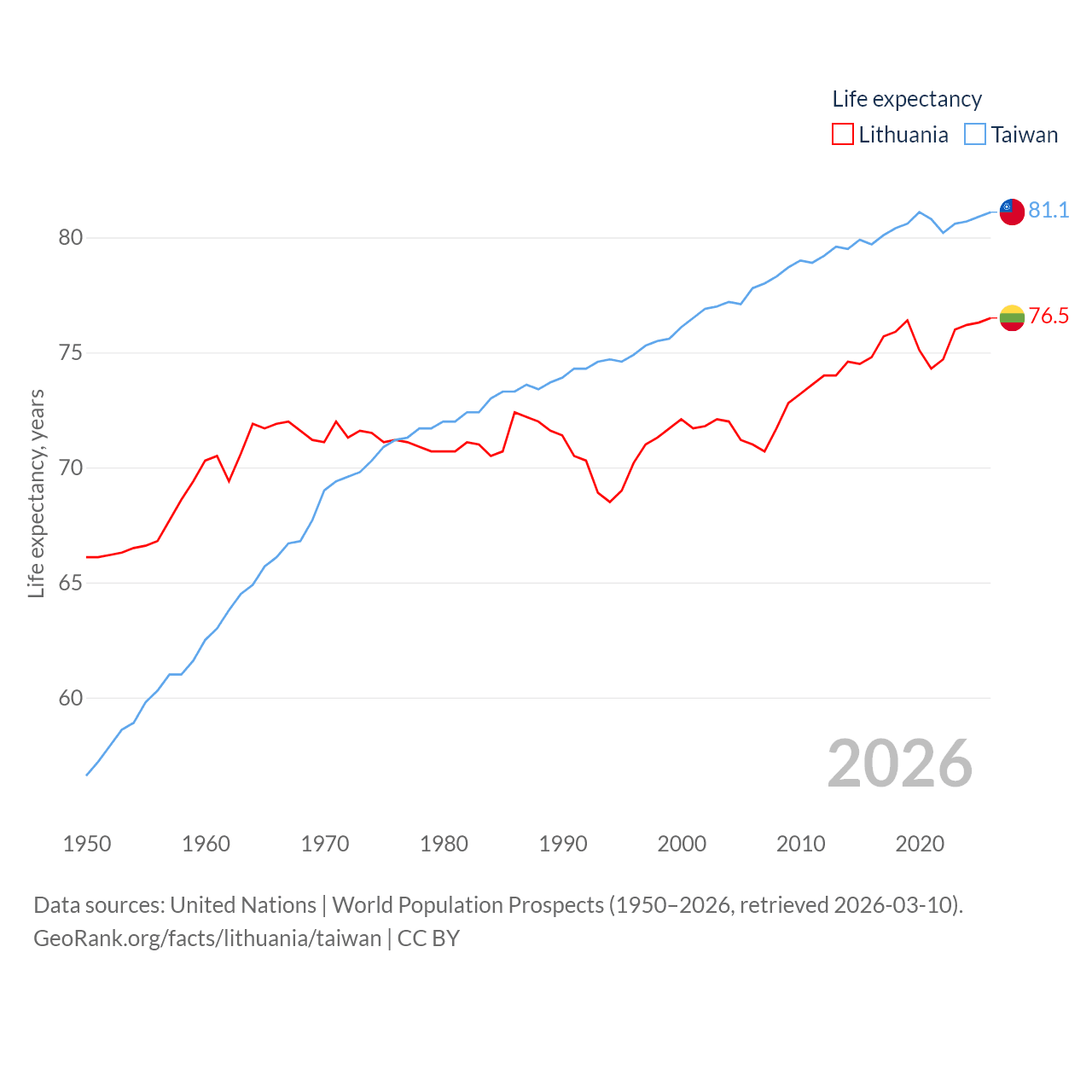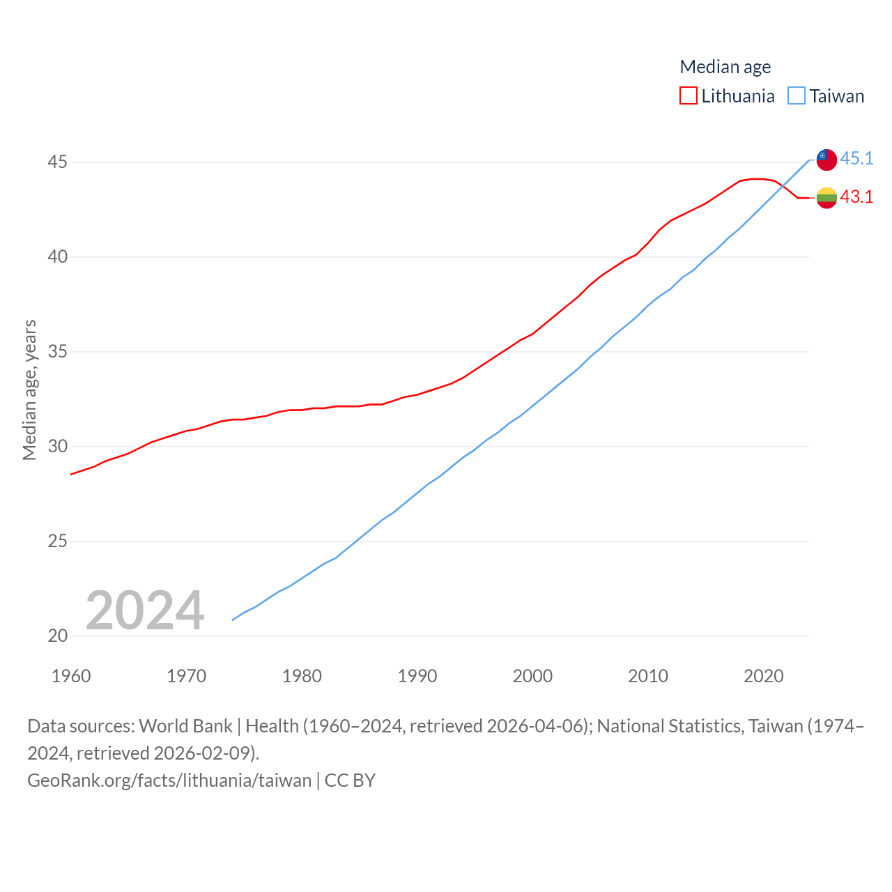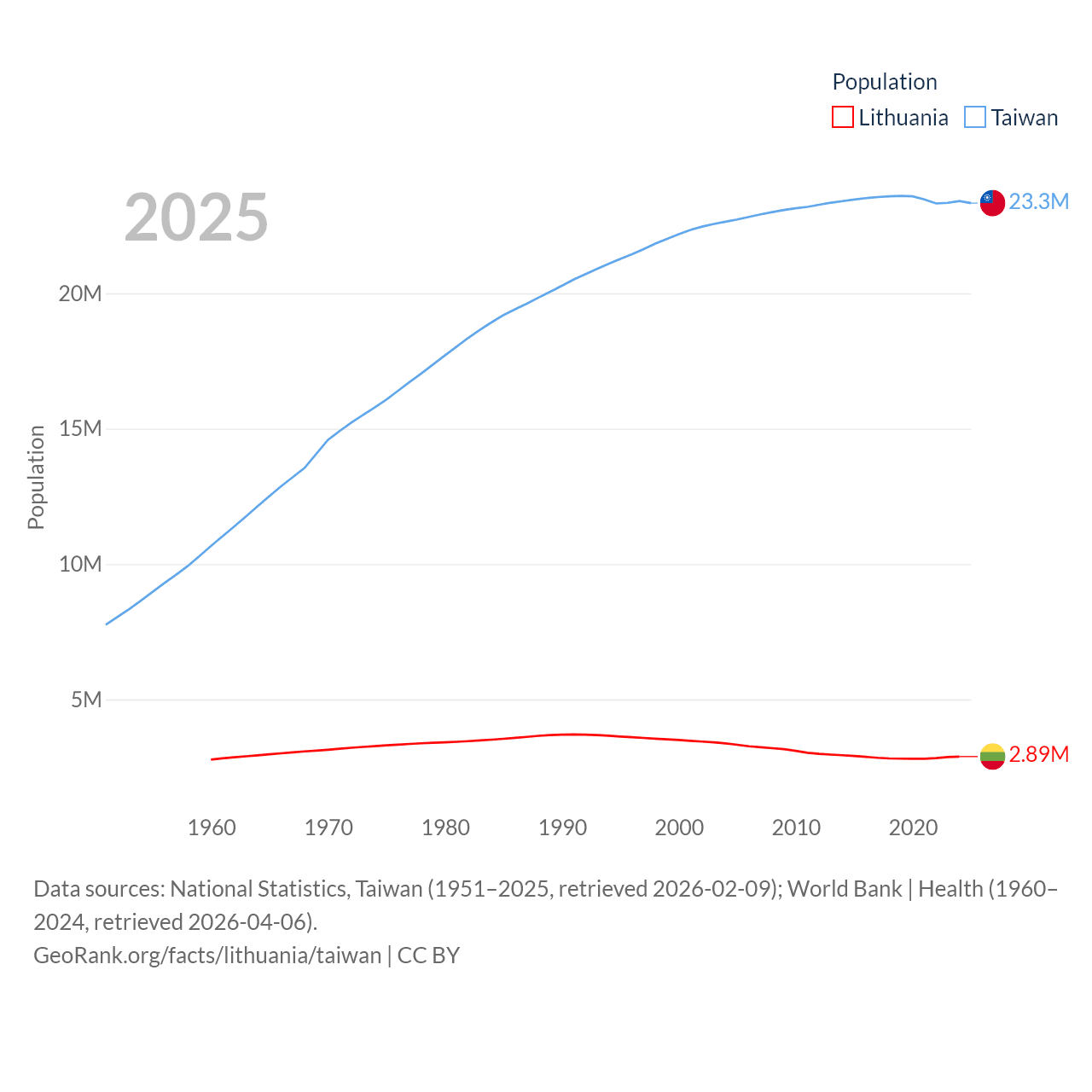 Lithuania has a population of 2.89M (ranked 137/197), compared with 23.3M in Taiwan (ranked 60/197). Lithuania's land area is 24,170 sq mi versus 13,976 sq mi for Taiwan (ranked 120th vs. 133rd).