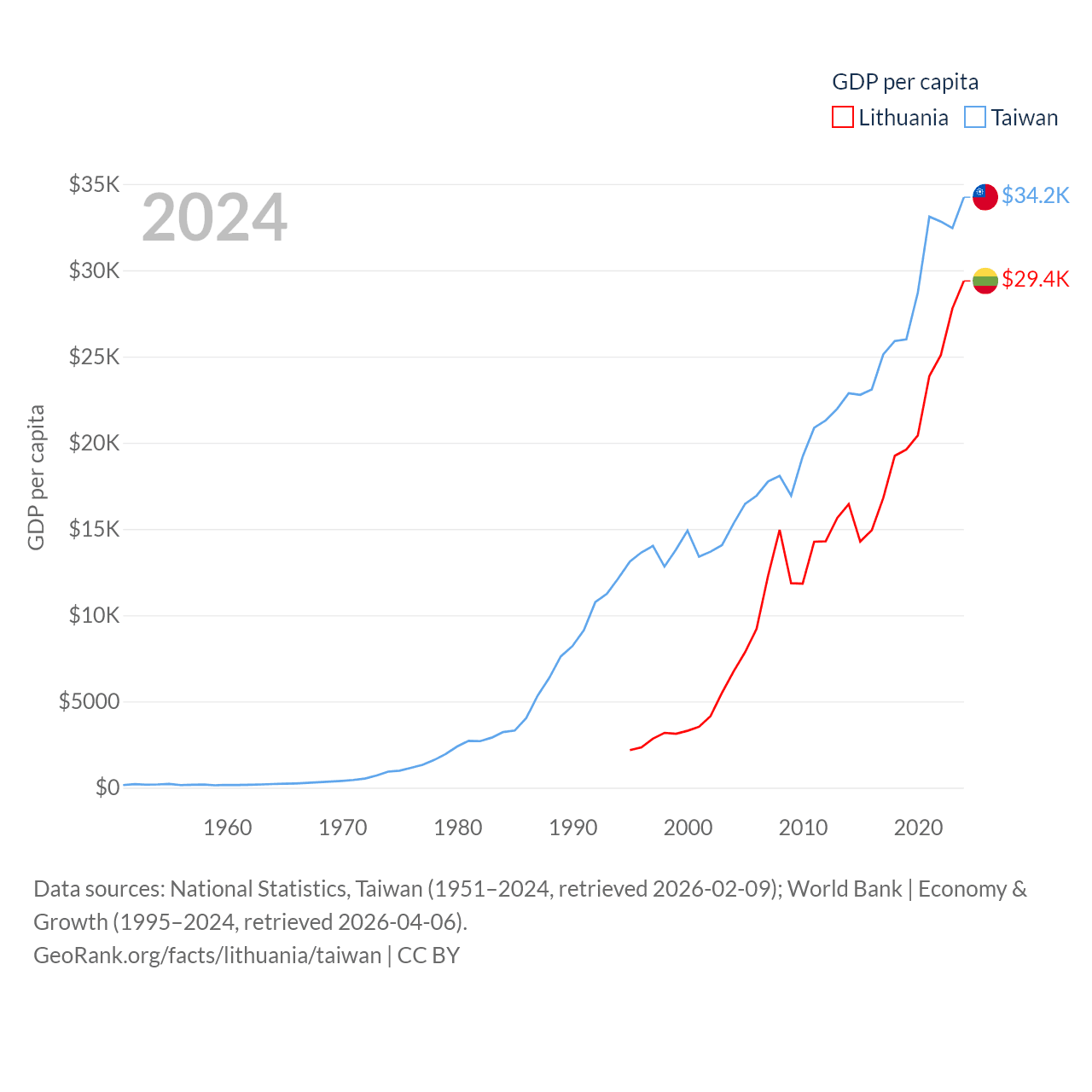 By GDP, Lithuania ranks 79/197 ($84.9B) and Taiwan ranks 22/197 ($802B). By GDP per capita, Lithuania ranks 43/197 ($29,384), while Taiwan ranks 35/197 ($34,238).