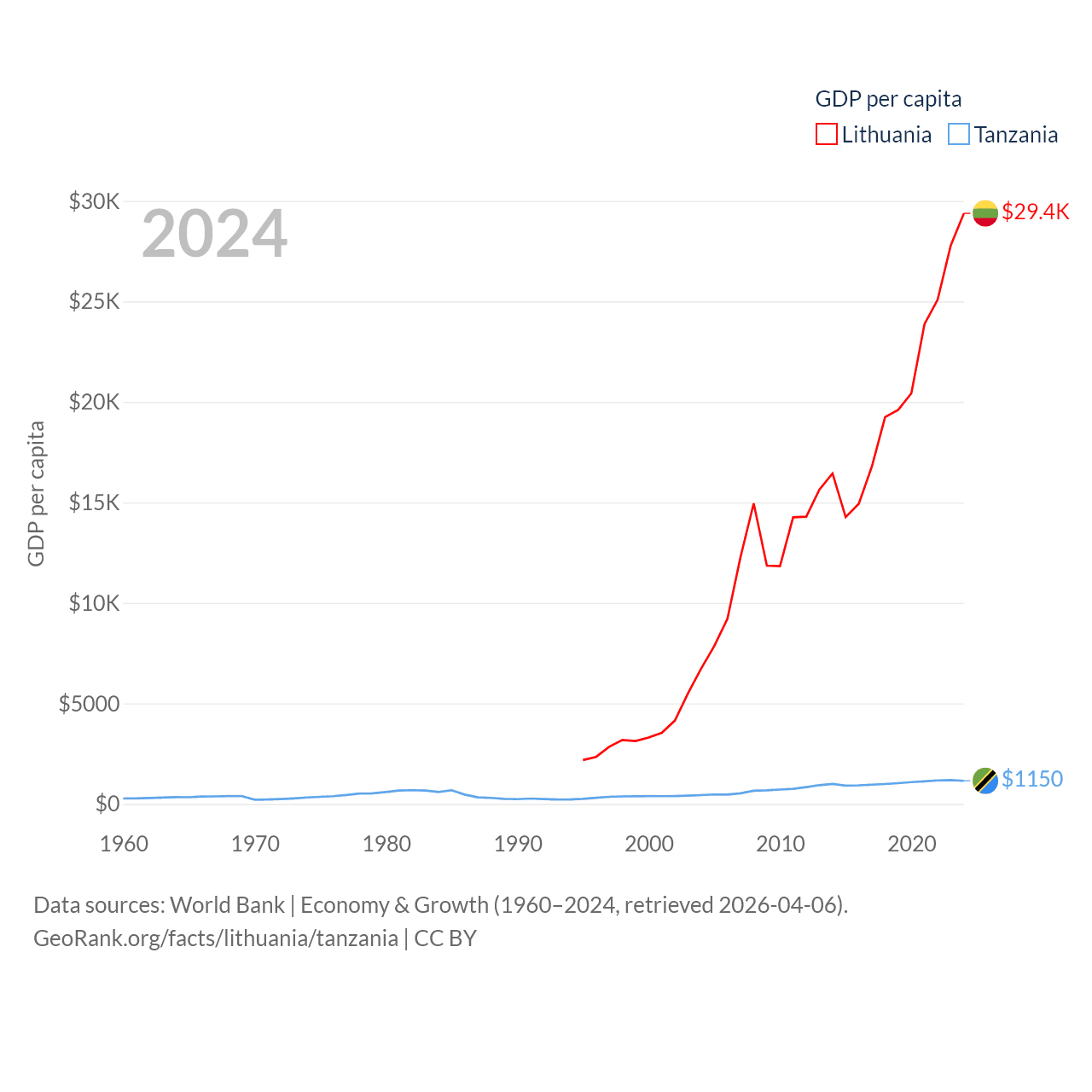 By GDP, Lithuania ranks 79/197 ($84.9B) and Tanzania ranks 82/197 ($78.8B). By GDP per capita, Lithuania ranks 43/197 ($29,384), while Tanzania ranks 170/197 ($1,150).