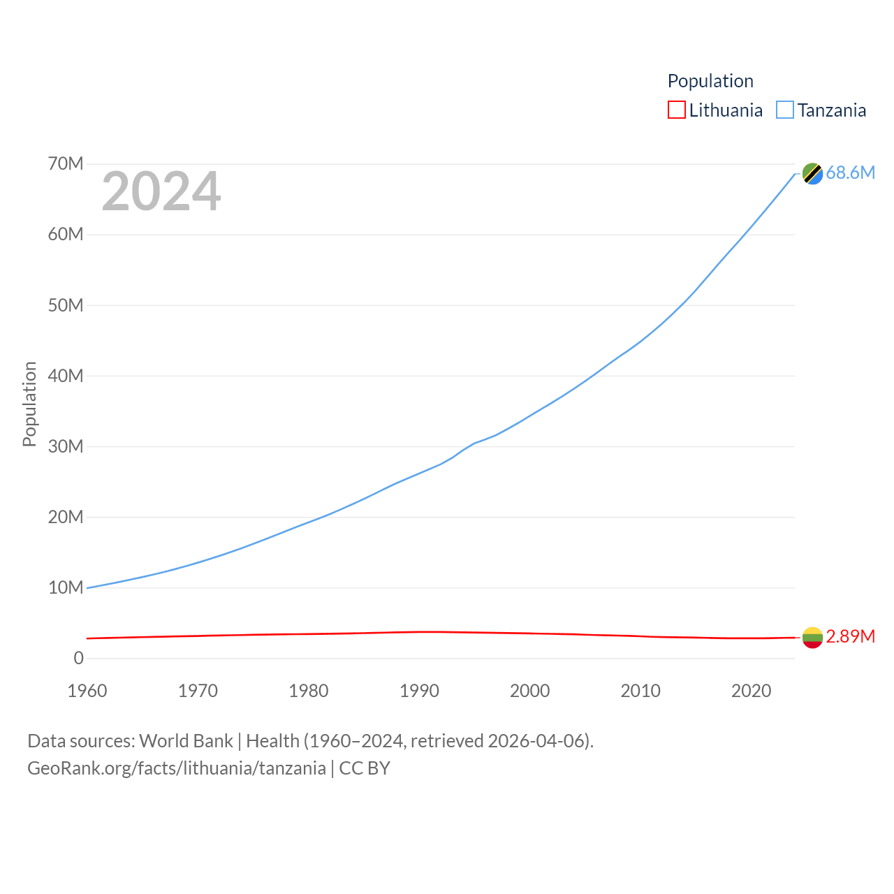 Lithuania has a population of 2.89M (ranked 137/197), compared with 68.6M in Tanzania (ranked 22/197). Lithuania's land area is 24,170 sq mi versus 342,009 sq mi for Tanzania (ranked 120th vs. 31st).
