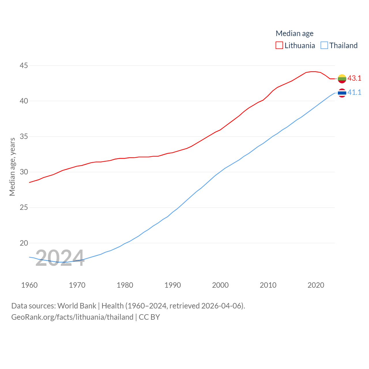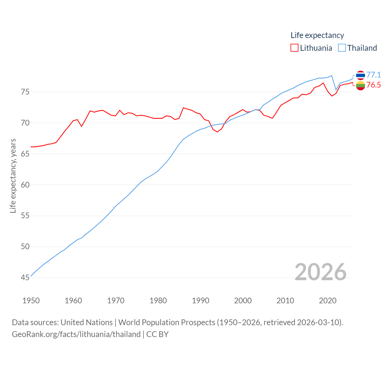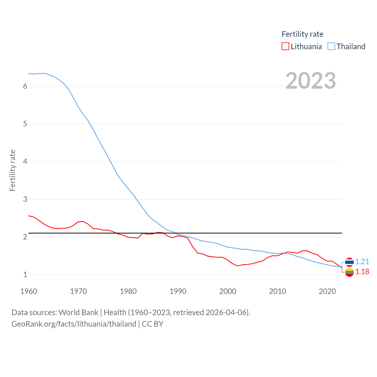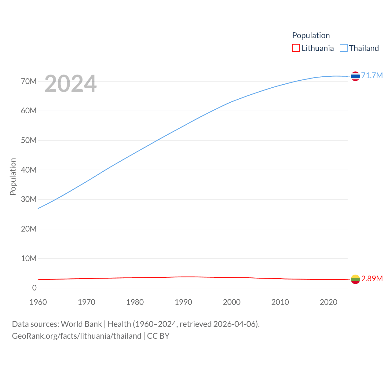 Lithuania has a population of 2.89M (ranked 137/197), compared with 71.7M in Thailand (ranked 20/197). Lithuania's land area is 24,170 sq mi versus 197,256 sq mi for Thailand (ranked 120th vs. 50th).