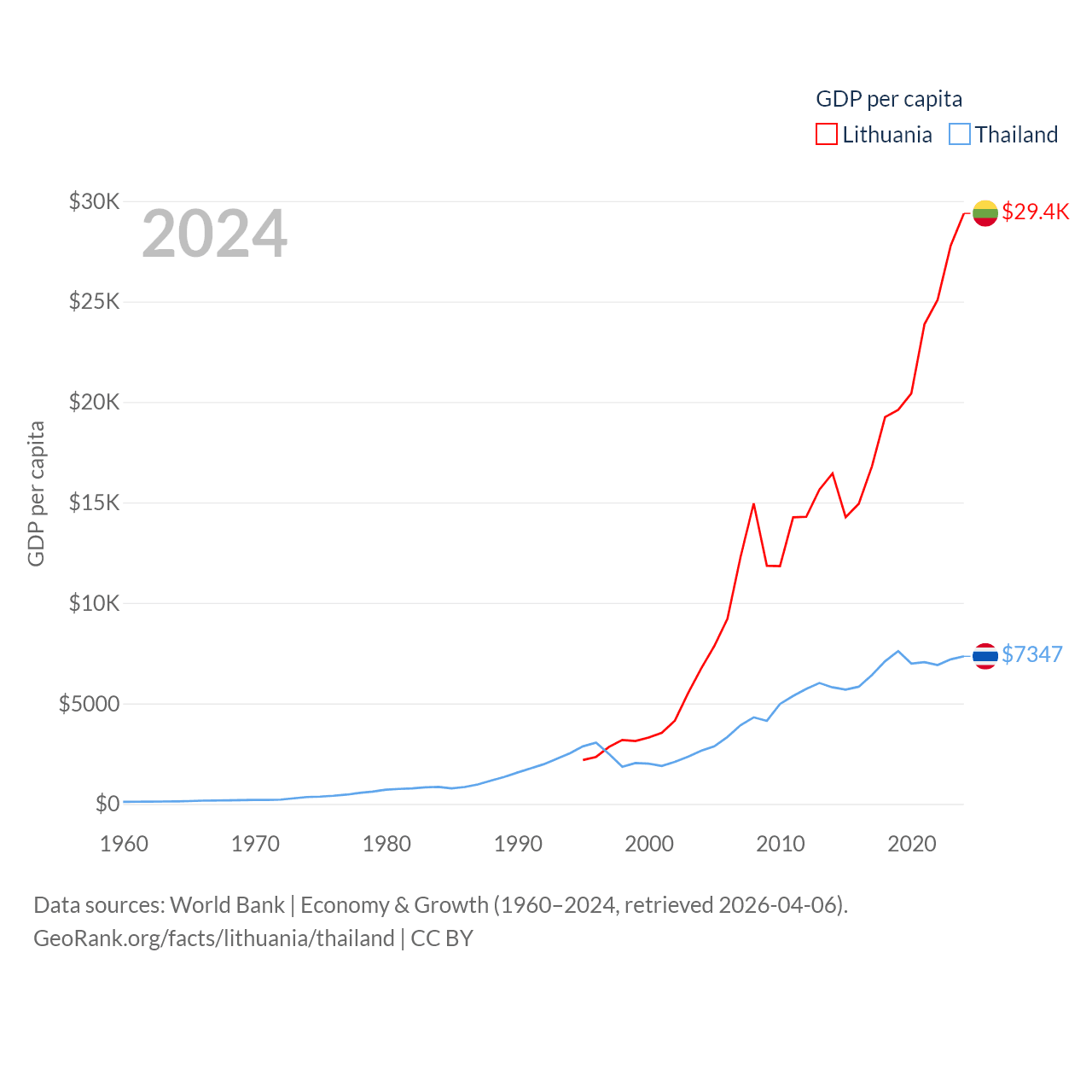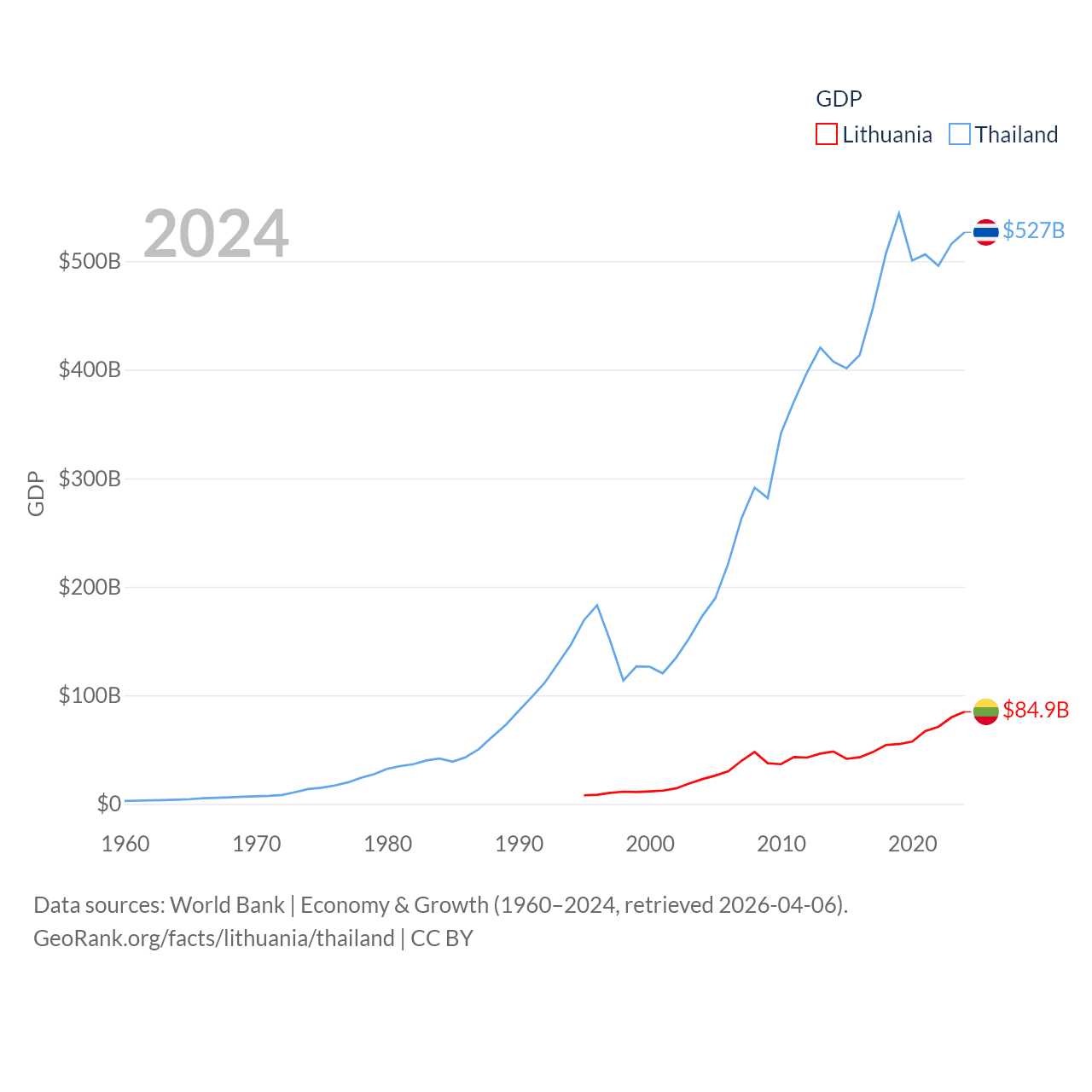 By GDP, Lithuania ranks 79/197 ($84.9B) and Thailand ranks 31/197 ($527B). By GDP per capita, Lithuania ranks 43/197 ($29,384), while Thailand ranks 100/197 ($7,347).