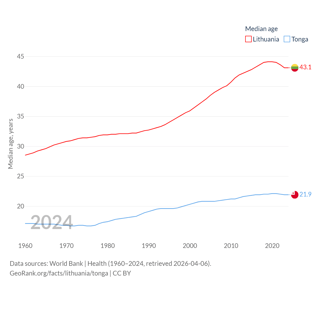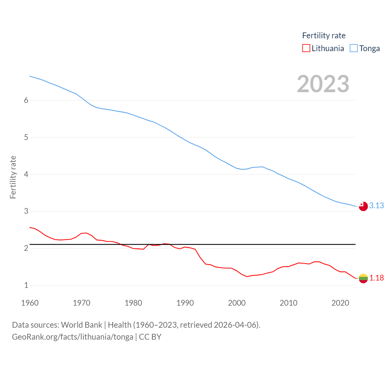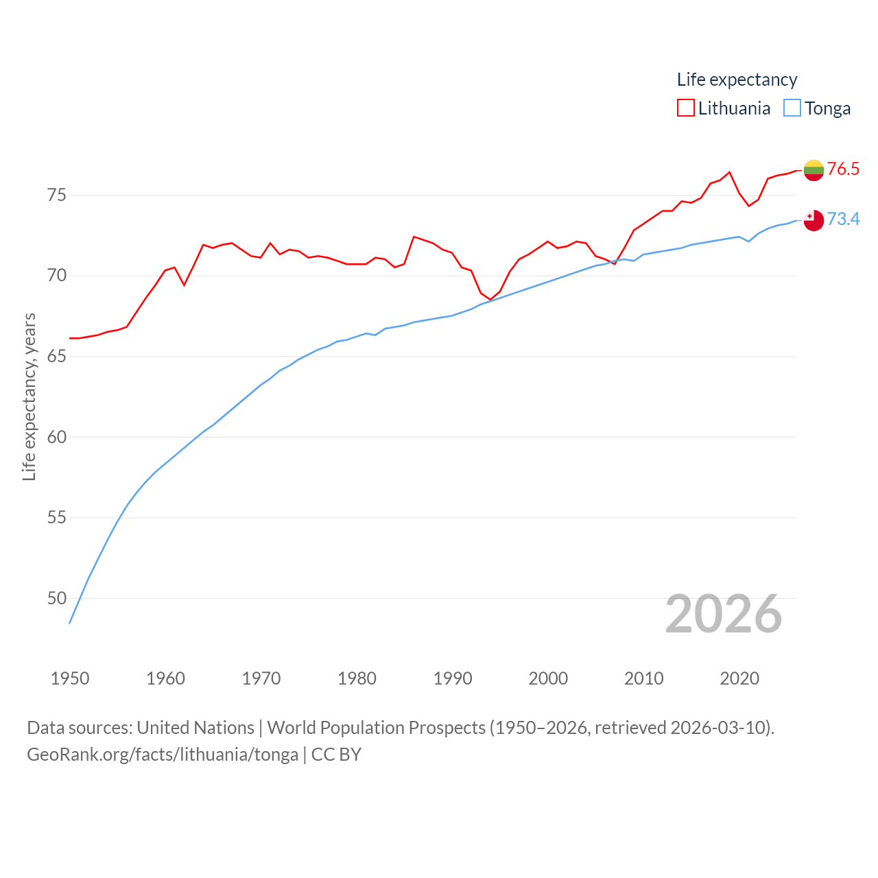 Lithuania has a population of 2.89M (ranked 137/197), compared with 104K in Tonga (ranked 183/197). Lithuania's land area is 24,170 sq mi versus 278 sq mi for Tonga (ranked 120th vs. 176th).