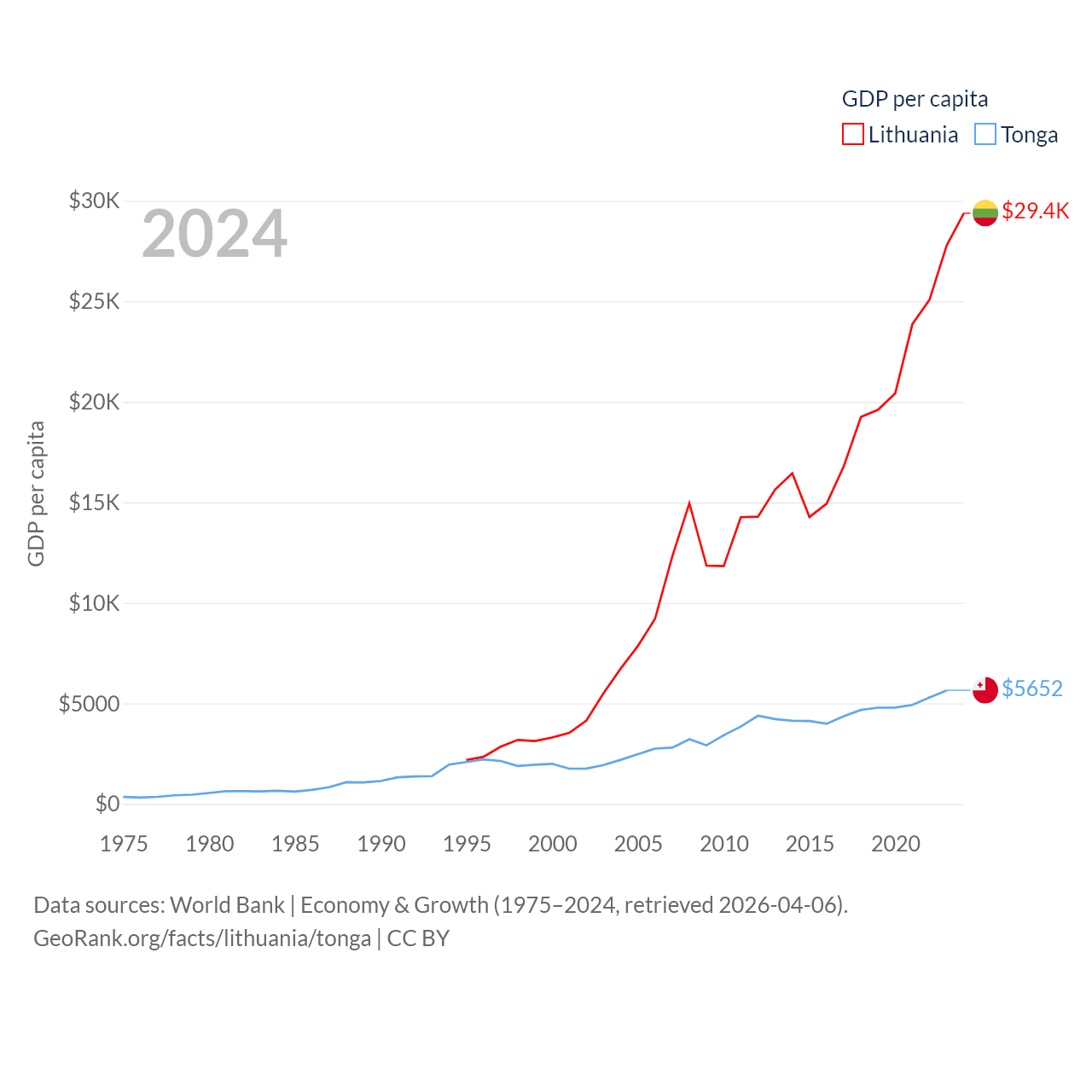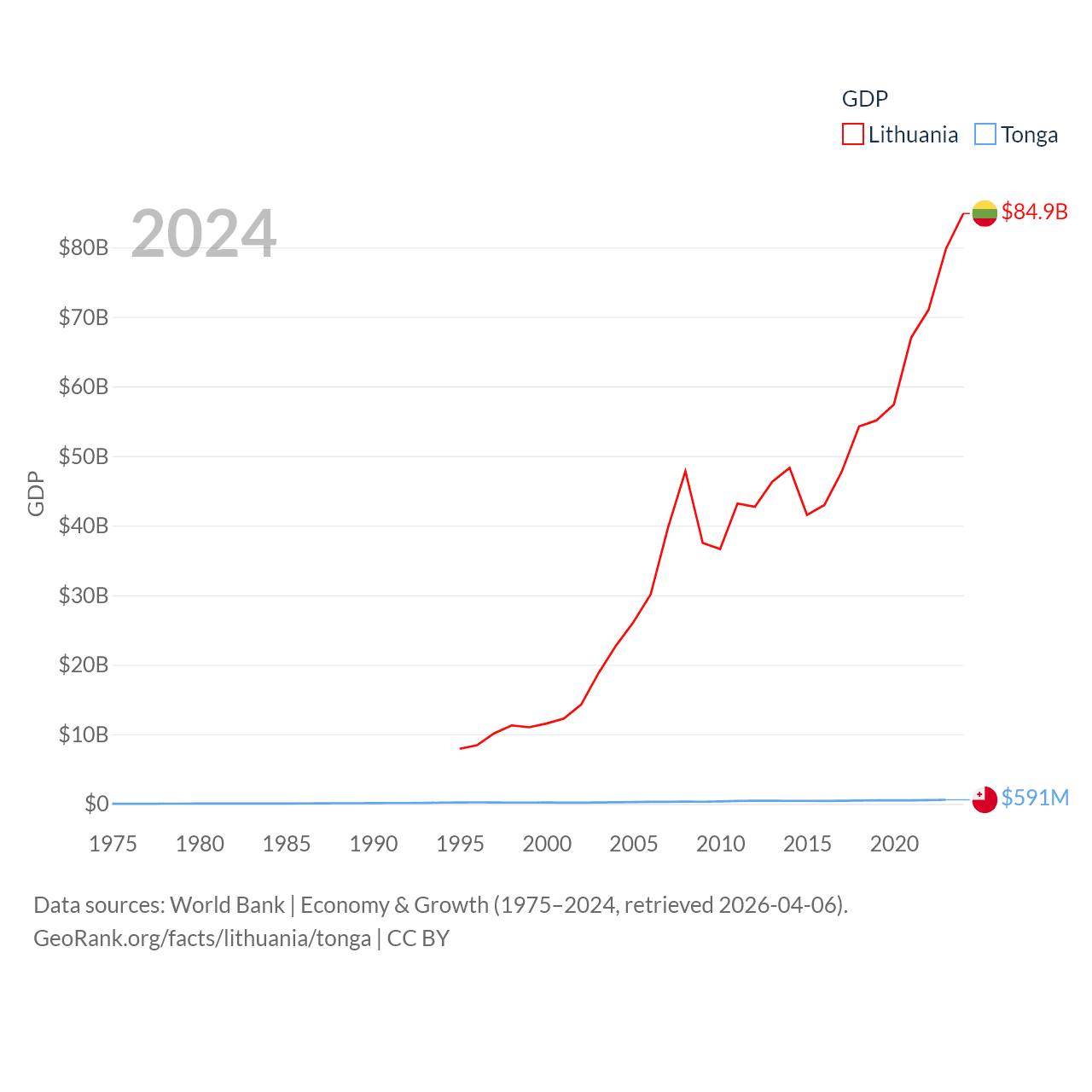 By GDP, Lithuania ranks 79/197 ($84.9B) and Tonga ranks 191/197 ($591M). By GDP per capita, Lithuania ranks 43/197 ($29,384), while Tonga ranks 115/197 ($5,652).