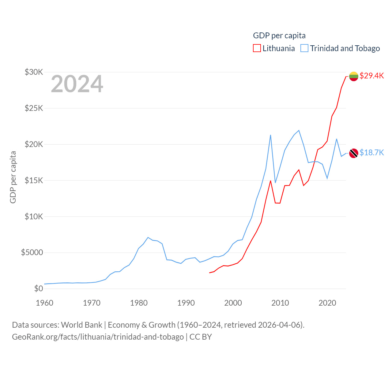 By GDP, Lithuania ranks 79/197 ($84.9B) and Trinidad and Tobago ranks 115/197 ($25.6B). By GDP per capita, Lithuania ranks 43/197 ($29,384), while Trinidad and Tobago ranks 61/197 ($18,733).