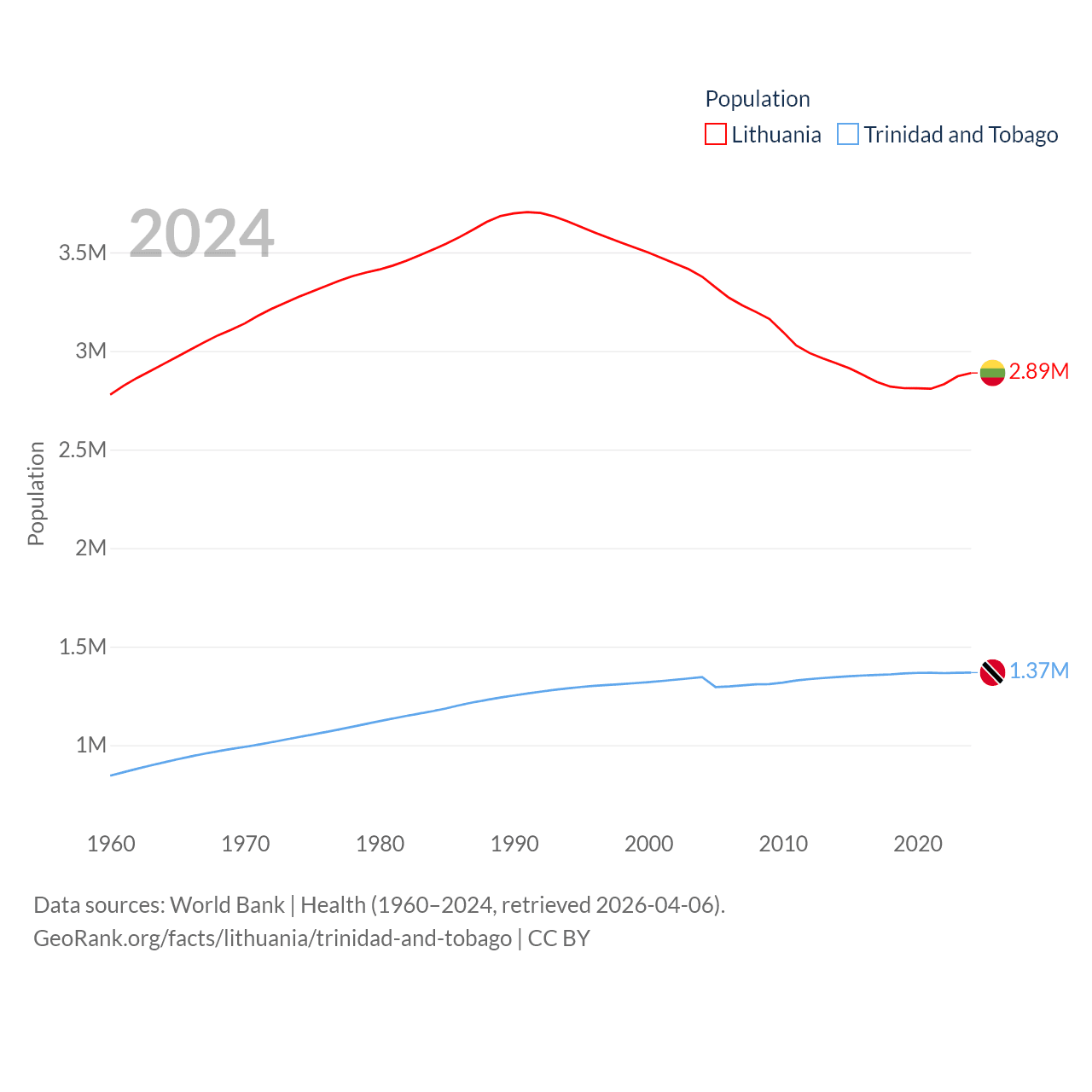 Lithuania has a population of 2.89M (ranked 137/197), compared with 1.37M in Trinidad and Tobago (ranked 154/197). Lithuania's land area is 24,170 sq mi versus 1,981 sq mi for Trinidad and Tobago (ranked 120th vs. 166th).