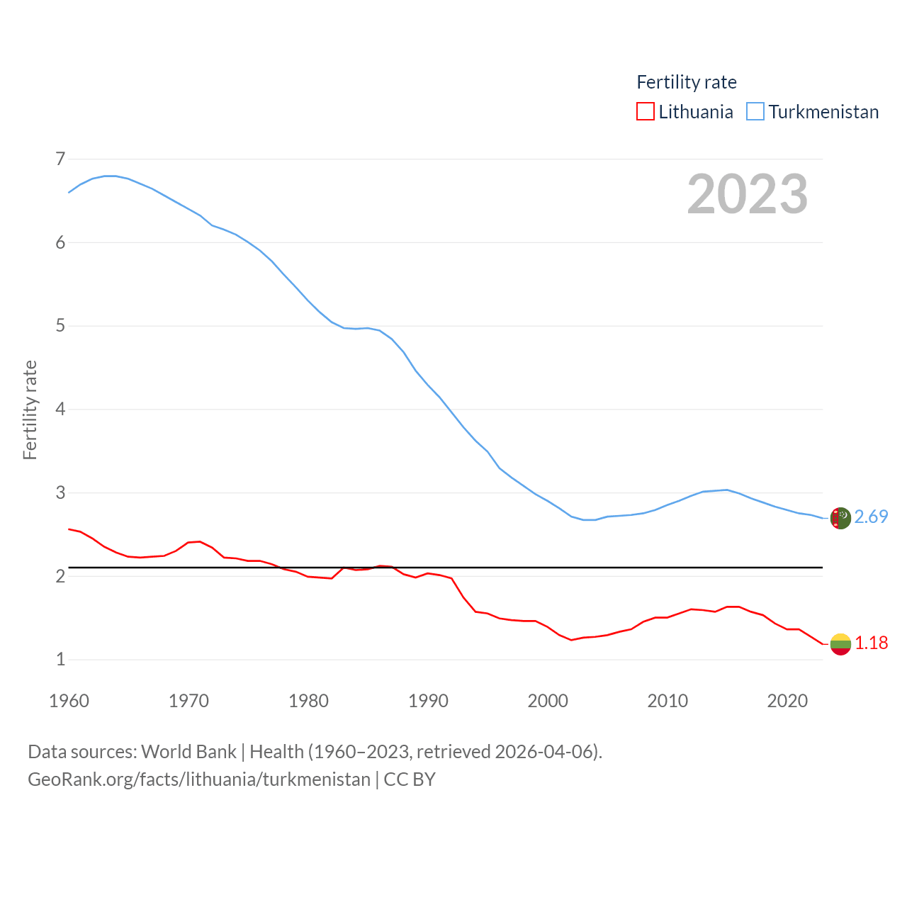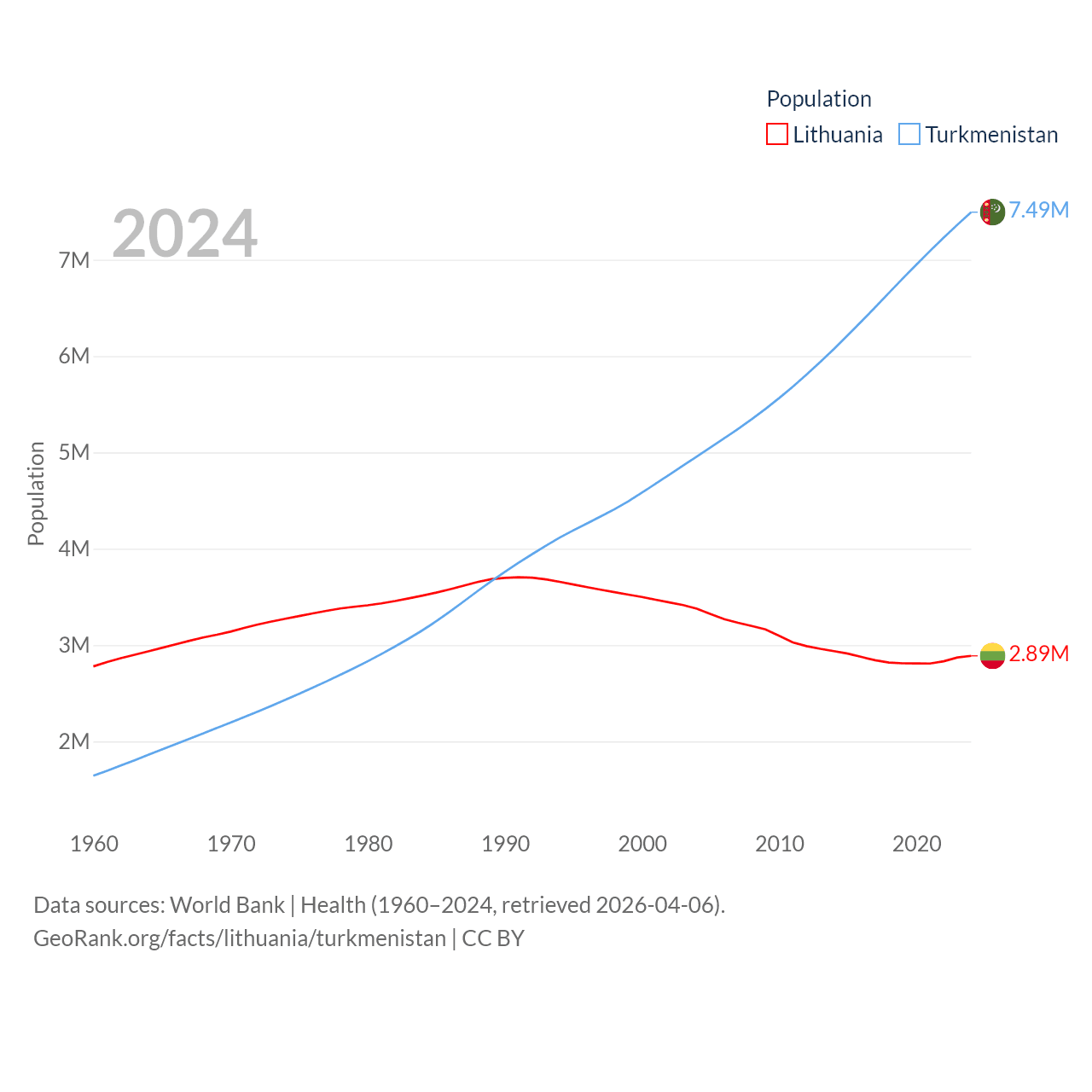 Lithuania has a population of 2.89M (ranked 137/197), compared with 7.49M in Turkmenistan (ranked 104/197). Lithuania's land area is 24,170 sq mi versus 181,441 sq mi for Turkmenistan (ranked 120th vs. 53rd).