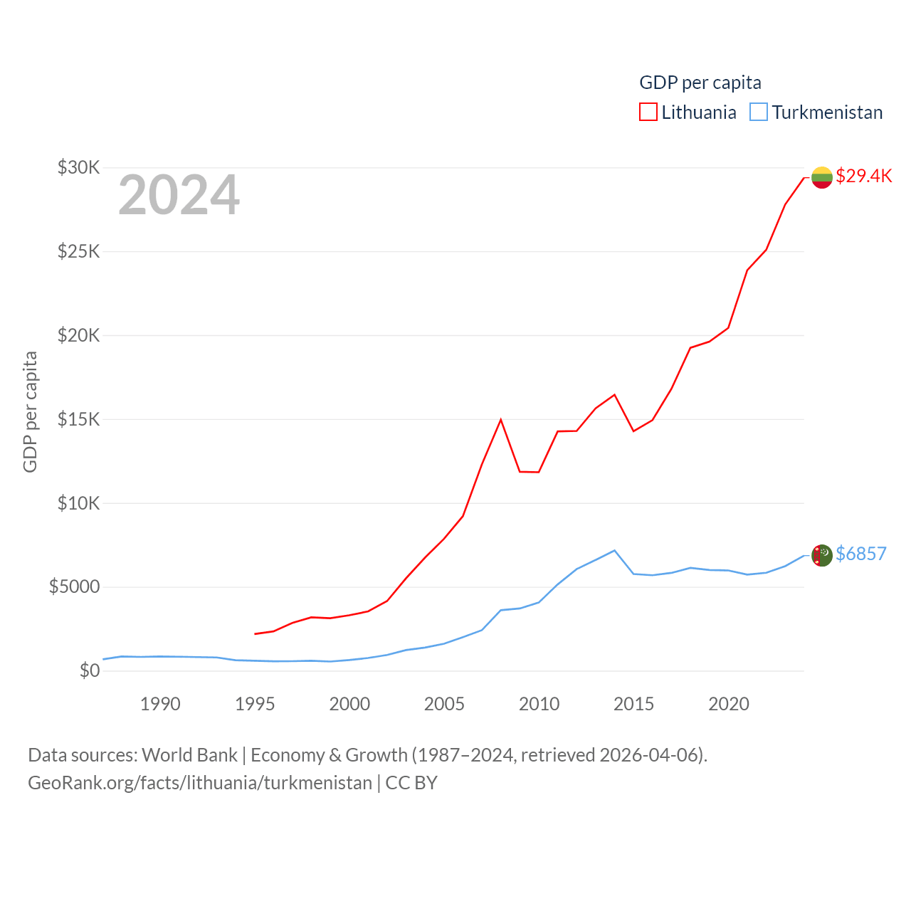 By GDP, Lithuania ranks 79/197 ($84.9B) and Turkmenistan ranks 92/197 ($51.4B). By GDP per capita, Lithuania ranks 43/197 ($29,384), while Turkmenistan ranks 104/197 ($6,857).