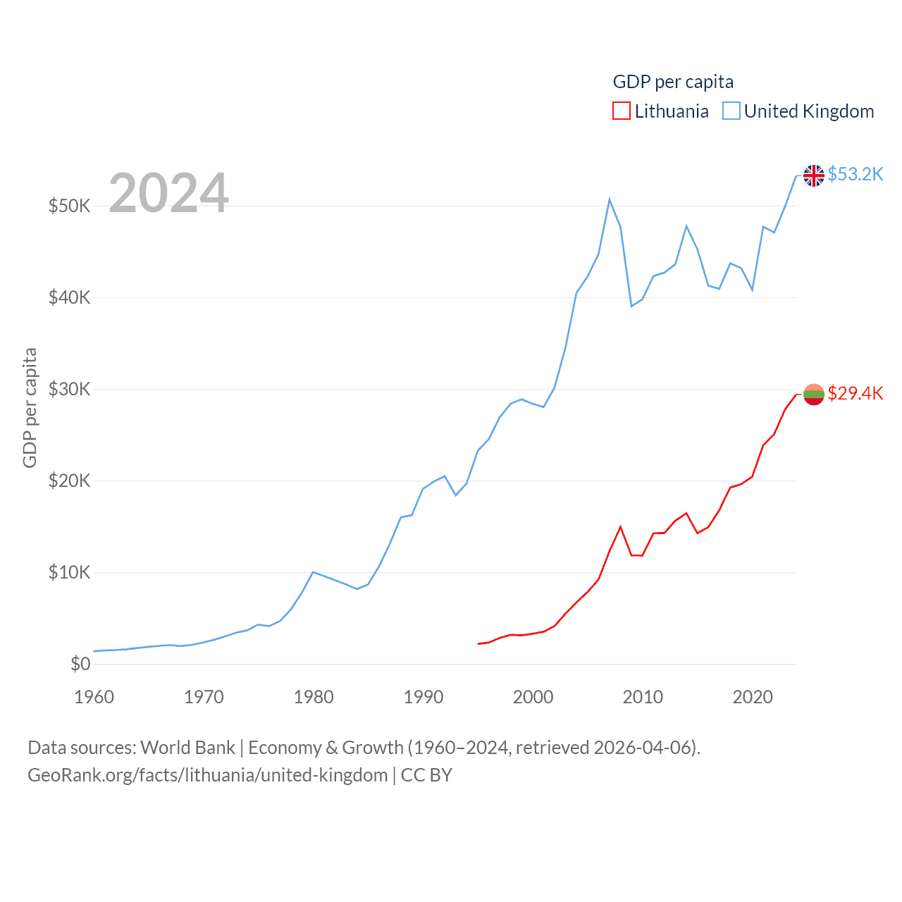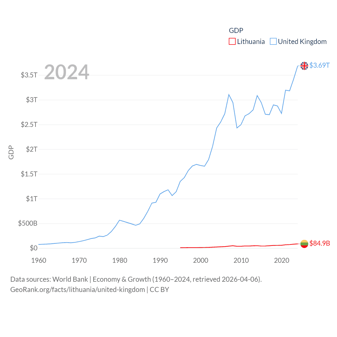 By GDP, Lithuania ranks 79/197 ($84.9B) and The United Kingdom ranks 6/197 ($3.69T). By GDP per capita, Lithuania ranks 43/197 ($29,384), while The United Kingdom ranks 22/197 ($53,246).