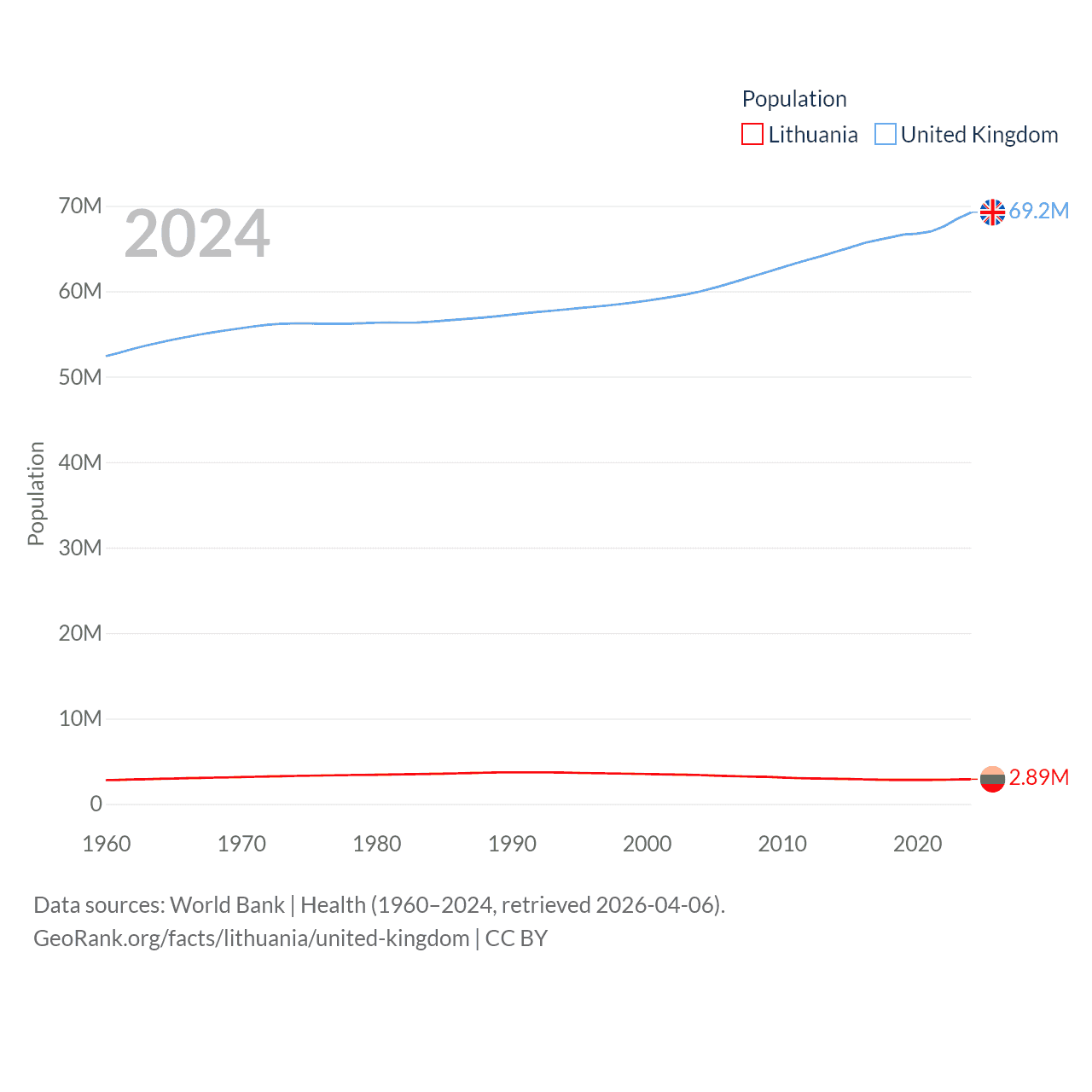 Lithuania has a population of 2.89M (ranked 137/197), compared with 69.2M in The United Kingdom (ranked 21/197). Lithuania's land area is 24,170 sq mi versus 93,410 sq mi for The United Kingdom (ranked 120th vs. 78th).