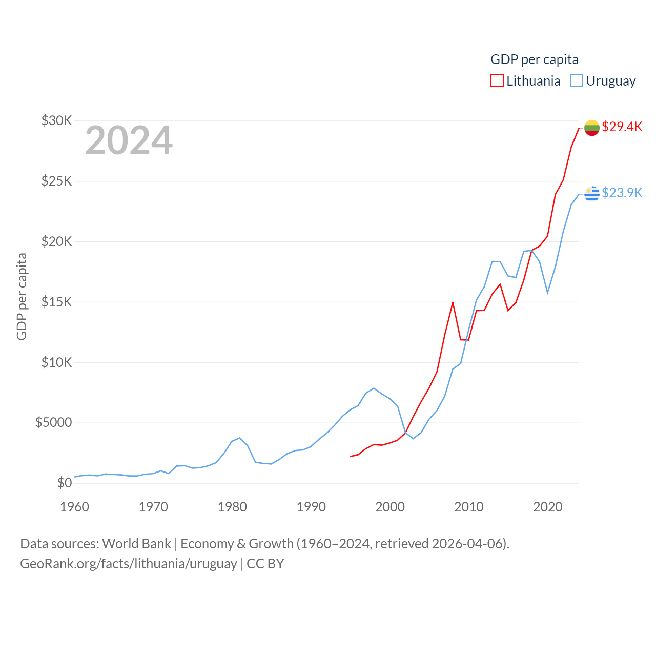 By GDP, Lithuania ranks 79/197 ($84.9B) and Uruguay ranks 81/197 ($81B). By GDP per capita, Lithuania ranks 43/197 ($29,384), while Uruguay ranks 52/197 ($23,907).