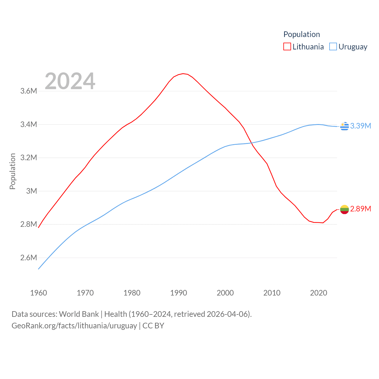 Lithuania has a population of 2.89M (ranked 137/197), compared with 3.39M in Uruguay (ranked 133/197). Lithuania's land area is 24,170 sq mi versus 67,576 sq mi for Uruguay (ranked 120th vs. 89th).