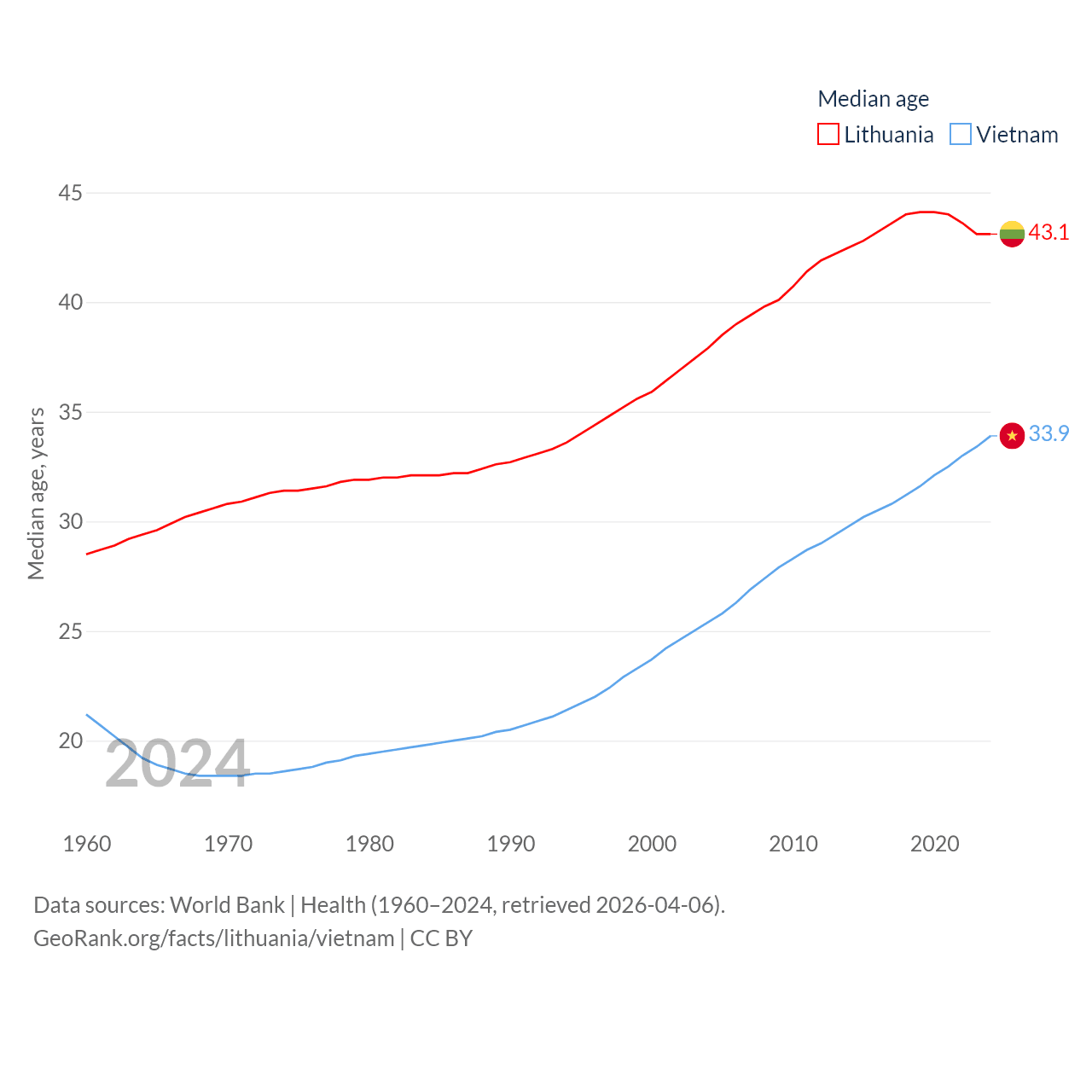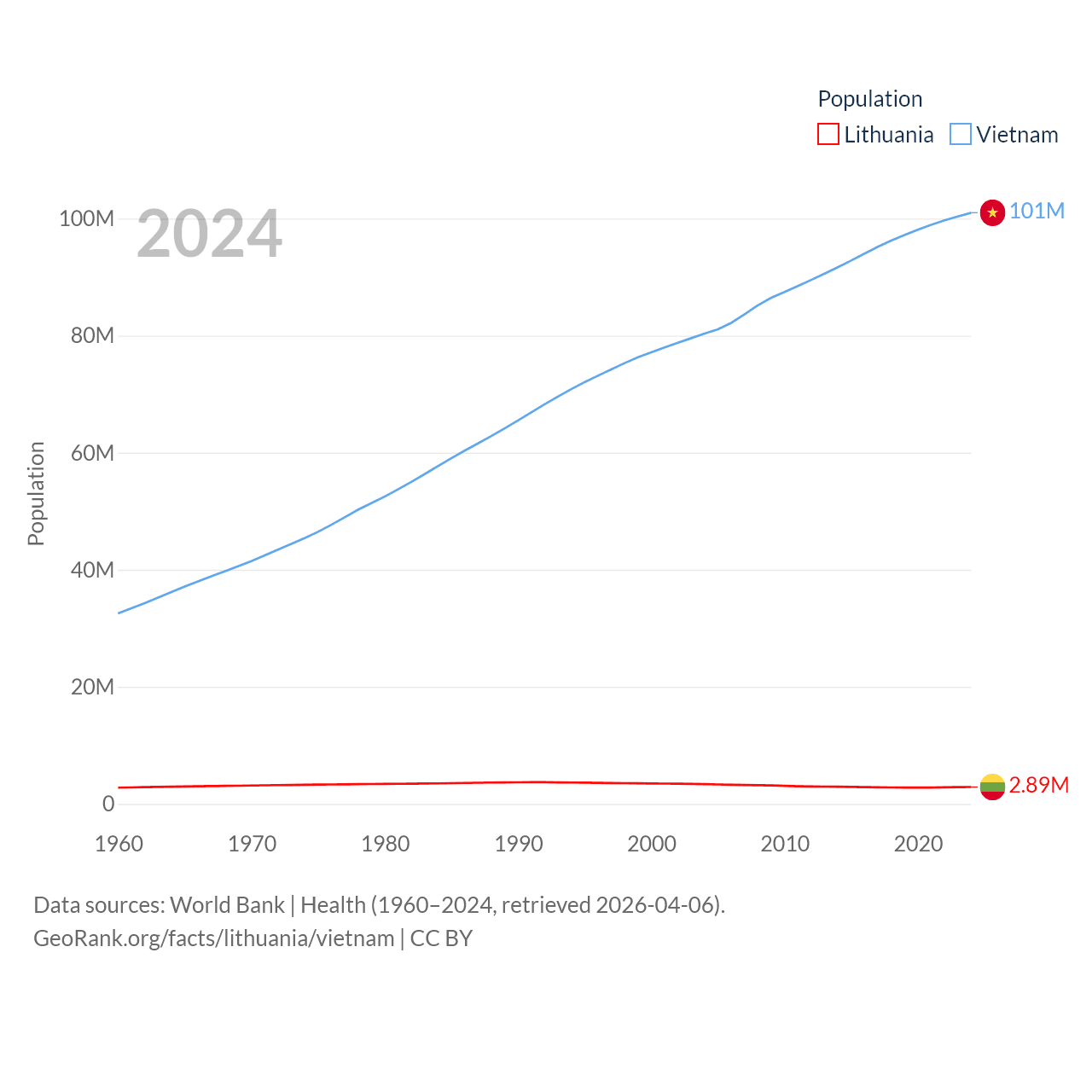Lithuania has a population of 2.89M (ranked 137/197), compared with 101M in Vietnam (ranked 16/197). Lithuania's land area is 24,170 sq mi versus 121,016 sq mi for Vietnam (ranked 120th vs. 67th).