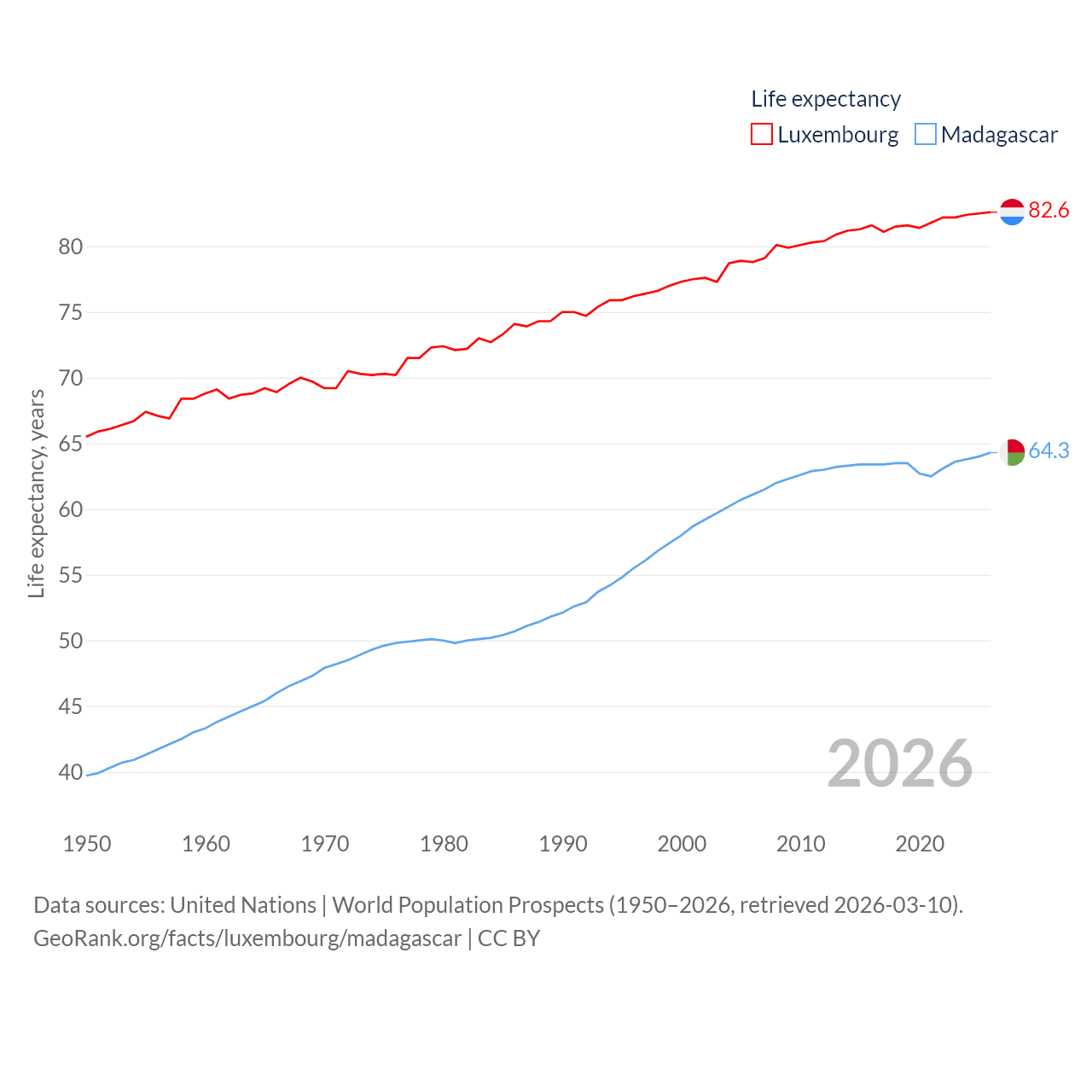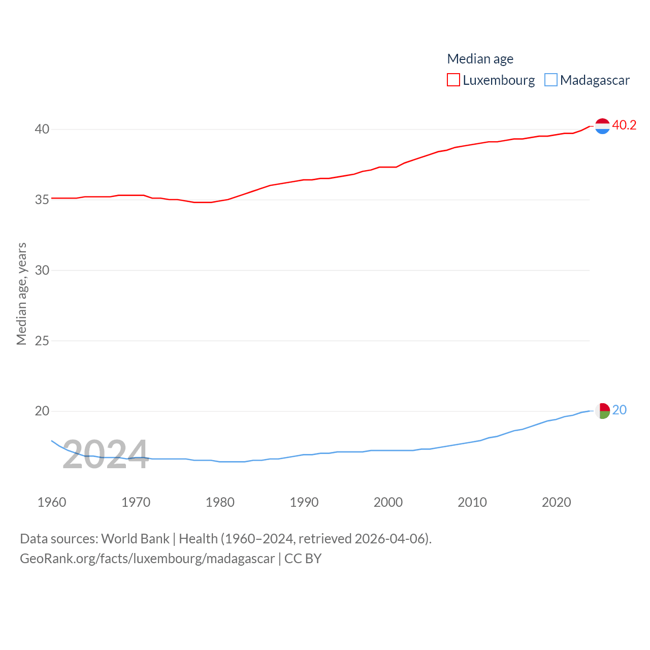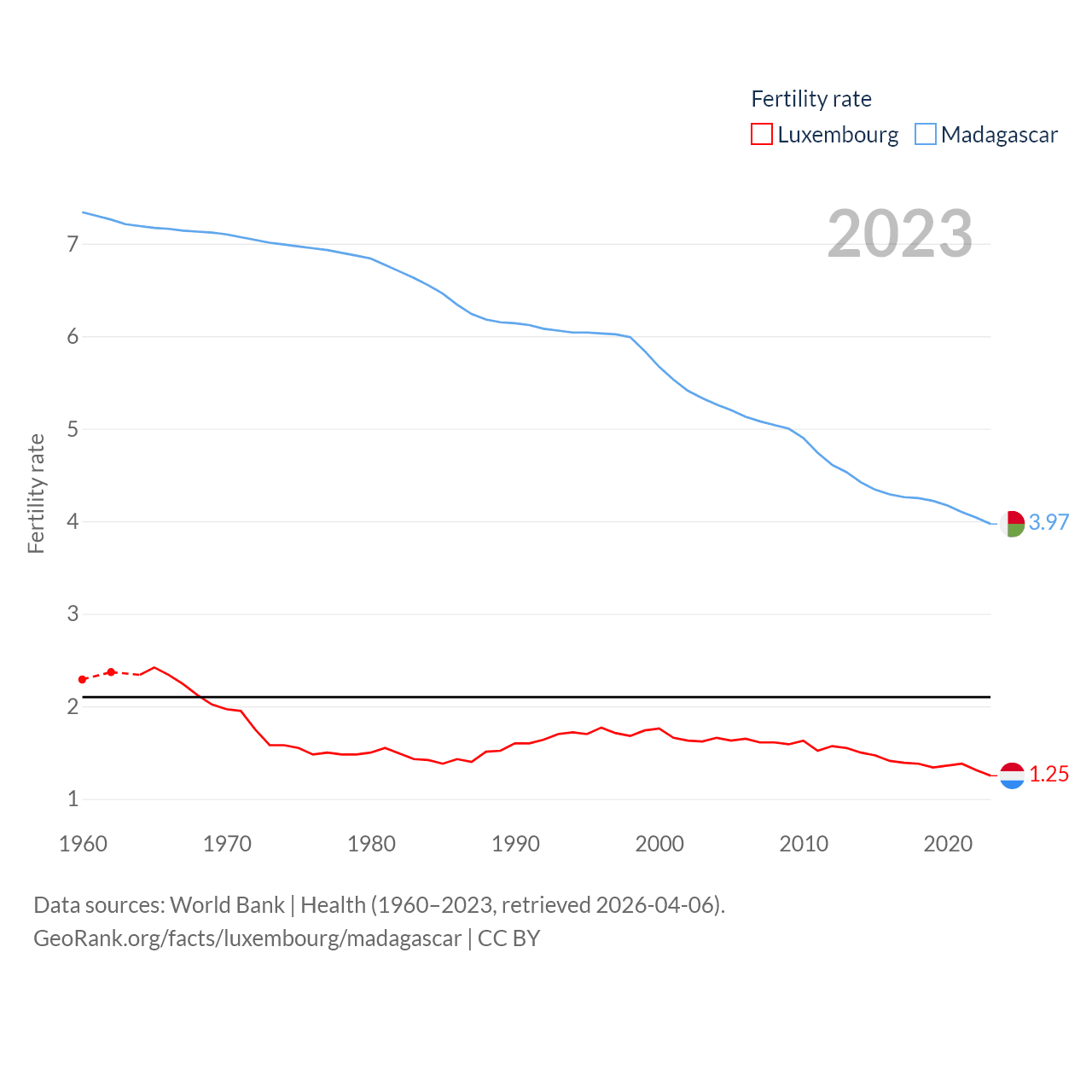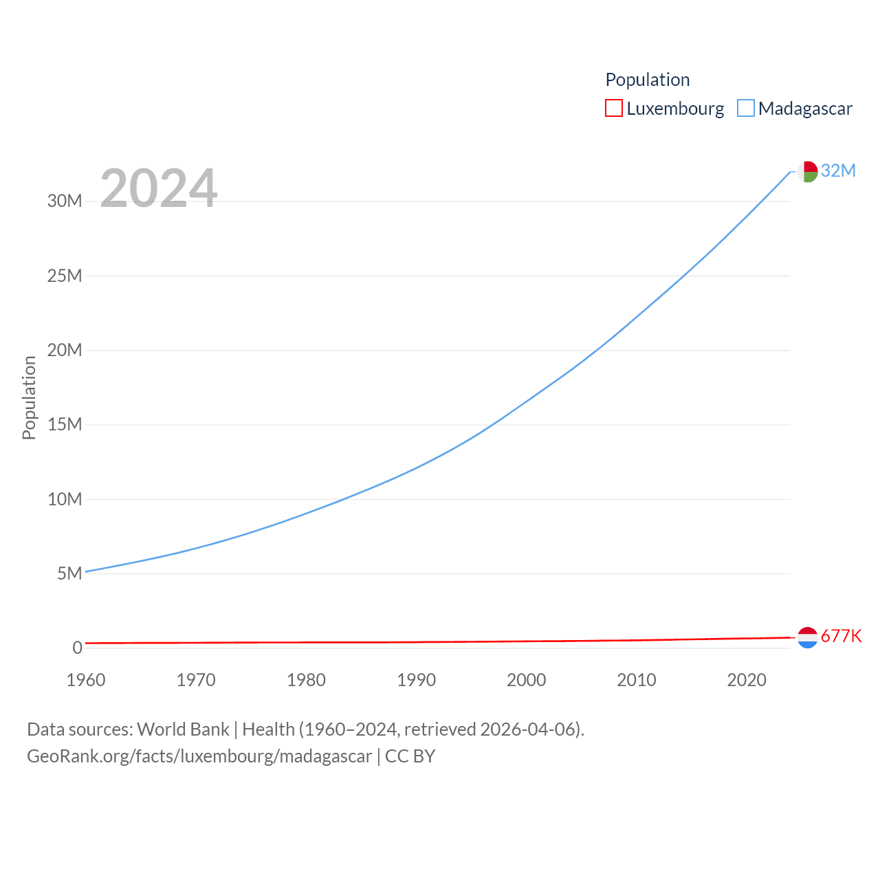 Luxembourg has a population of 677K (ranked 164/197), compared with 32M in Madagascar (ranked 49/197). Luxembourg's land area is 994 sq mi versus 224,634 sq mi for Madagascar (ranked 169th vs. 44th).