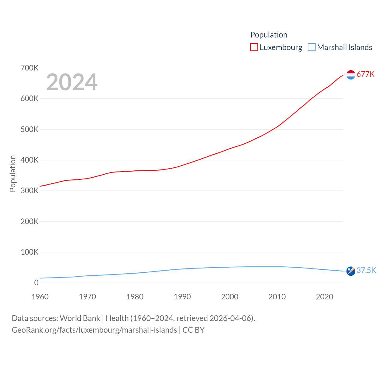 Luxembourg has a population of 677K (ranked 164/197), compared with 37.5K in The Marshall Islands (ranked 192/197). Luxembourg's land area is 994 sq mi versus 69.5 sq mi for The Marshall Islands (ranked 169th vs. 191st).