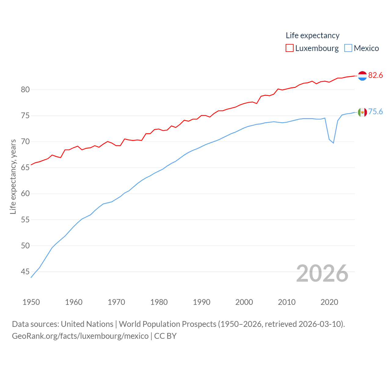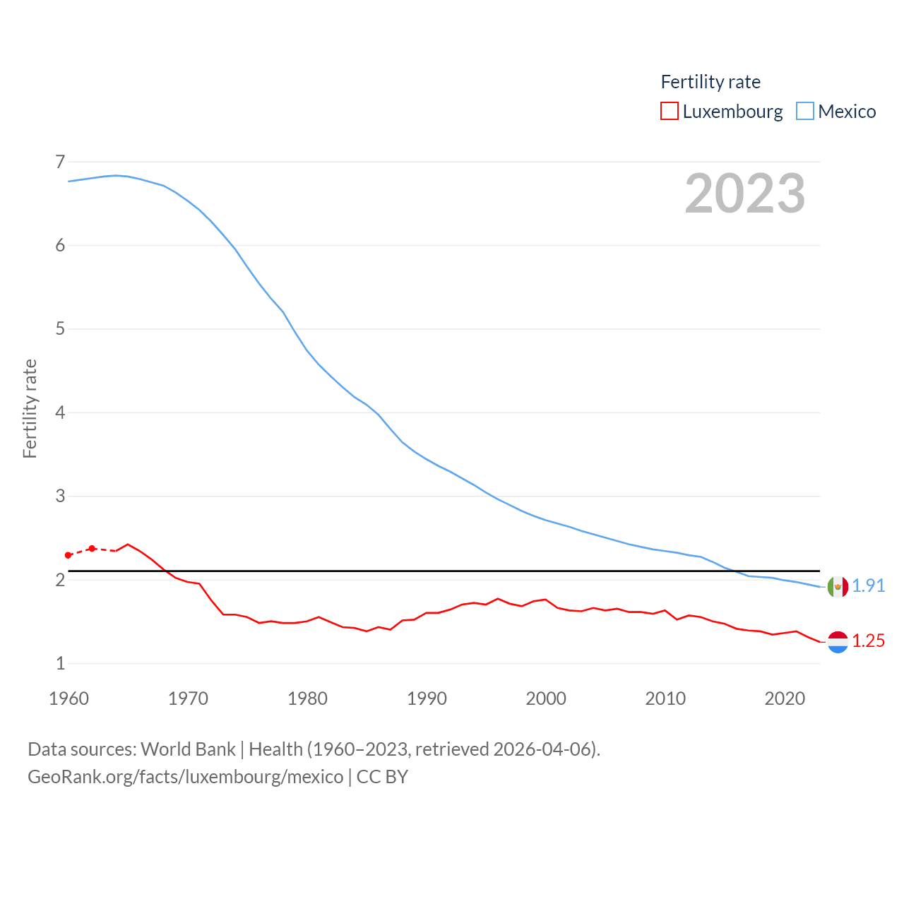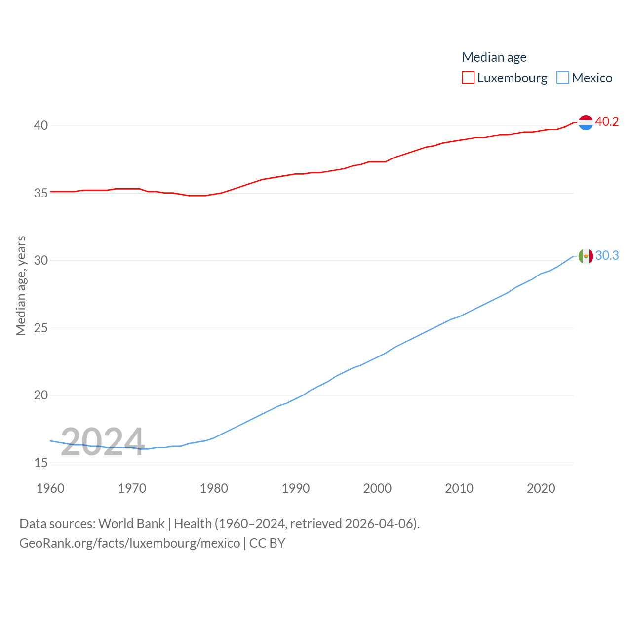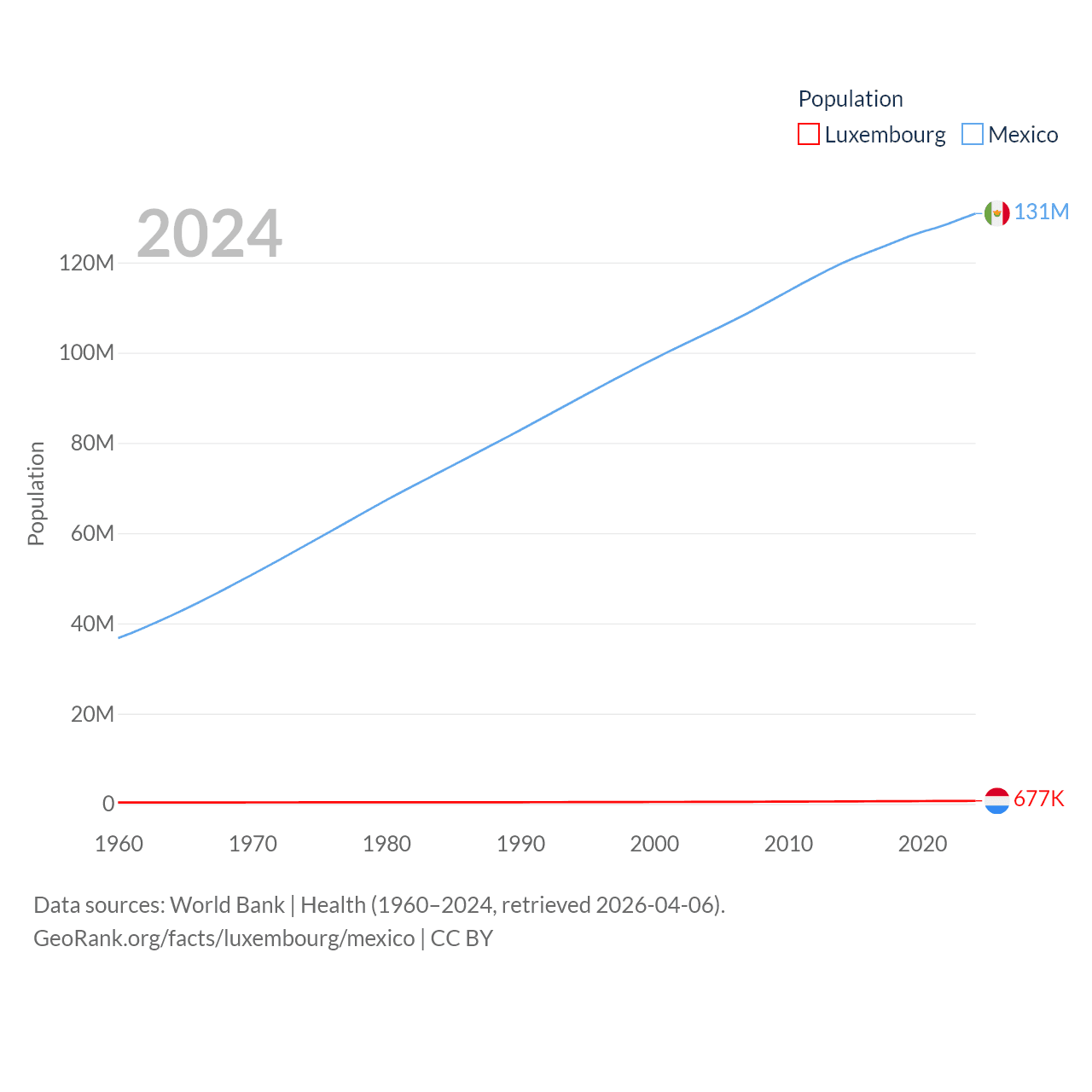 Luxembourg has a population of 677K (ranked 164/197), compared with 131M in Mexico (ranked 11/197). Luxembourg's land area is 994 sq mi versus 750,563 sq mi for Mexico (ranked 169th vs. 13th).