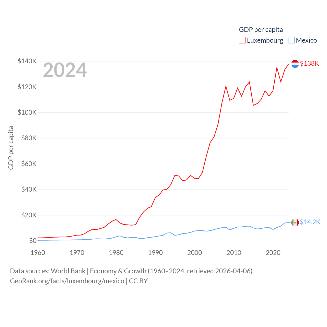 By GDP, Luxembourg ranks 74/197 ($93.3B) and Mexico ranks 13/197 ($1.86T). By GDP per capita, Luxembourg ranks 3/197 ($137,782), while Mexico ranks 69/197 ($14,186).