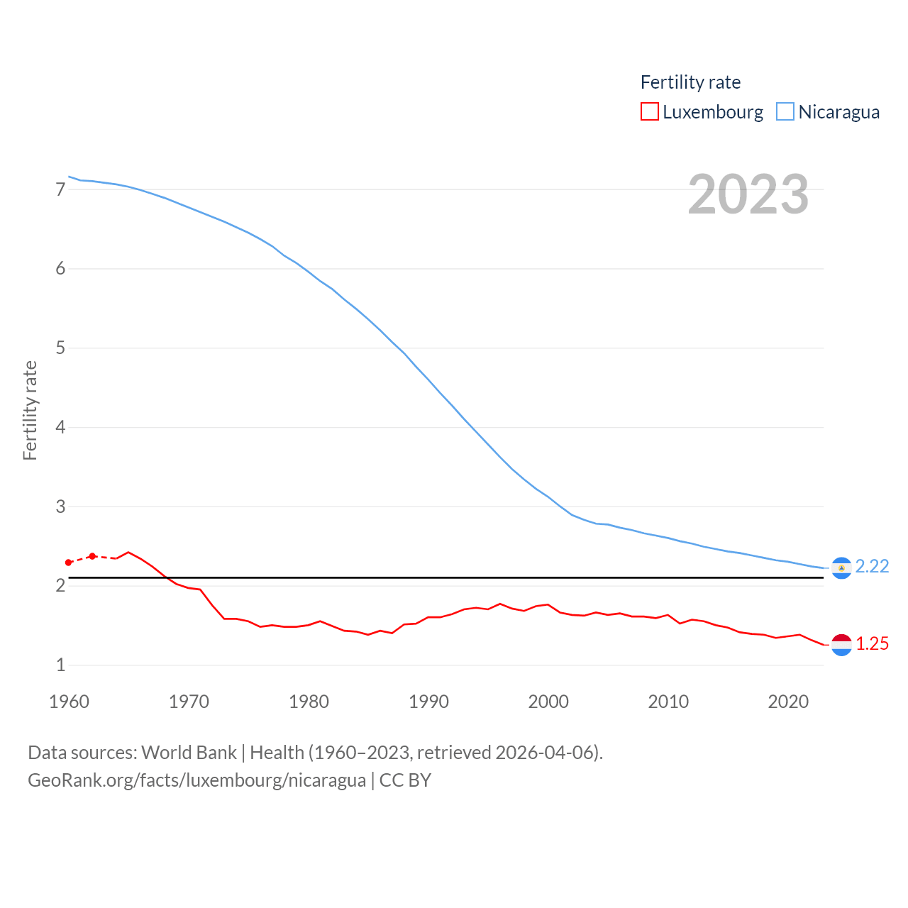 Luxembourg has a population of 677K (ranked 164/197), compared with 6.92M in Nicaragua (ranked 108/197). Luxembourg's land area is 994 sq mi versus 46,464 sq mi for Nicaragua (ranked 169th vs. 98th).