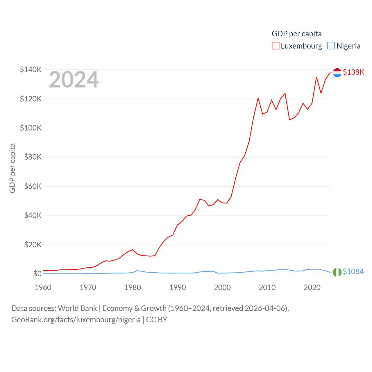 By GDP, Luxembourg ranks 74/197 ($93.3B) and Nigeria ranks 54/197 ($252B). By GDP per capita, Luxembourg ranks 3/197 ($137,782), while Nigeria ranks 174/197 ($1,084).
