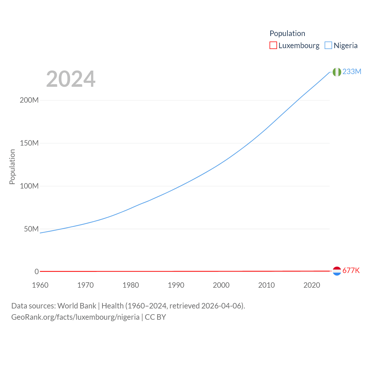 Luxembourg has a population of 677K (ranked 164/197), compared with 233M in Nigeria (ranked 6/197). Luxembourg's land area is 994 sq mi versus 351,650 sq mi for Nigeria (ranked 169th vs. 30th).