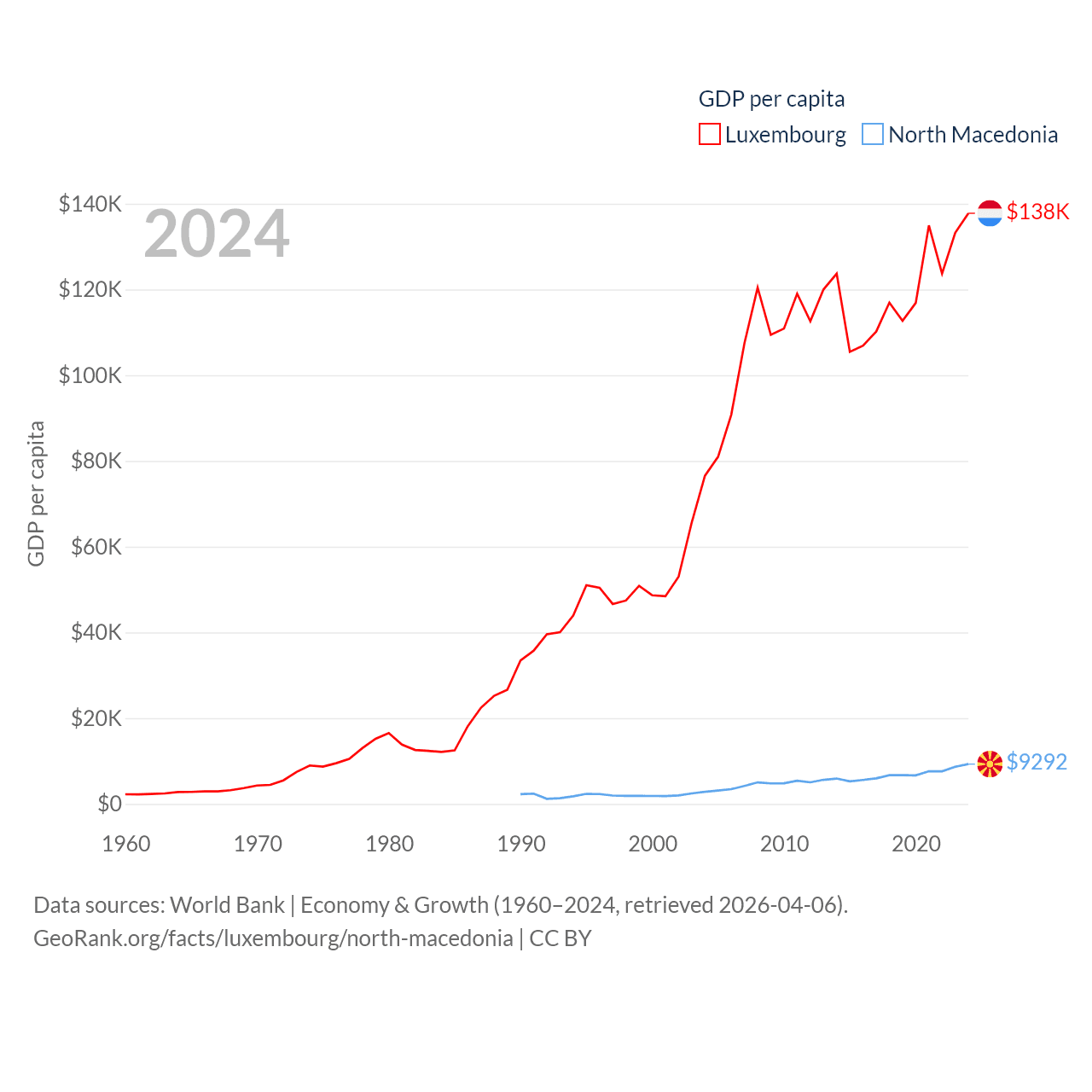By GDP, Luxembourg ranks 74/197 ($93.3B) and North Macedonia ranks 138/197 ($17B). By GDP per capita, Luxembourg ranks 3/197 ($137,782), while North Macedonia ranks 88/197 ($9,292).