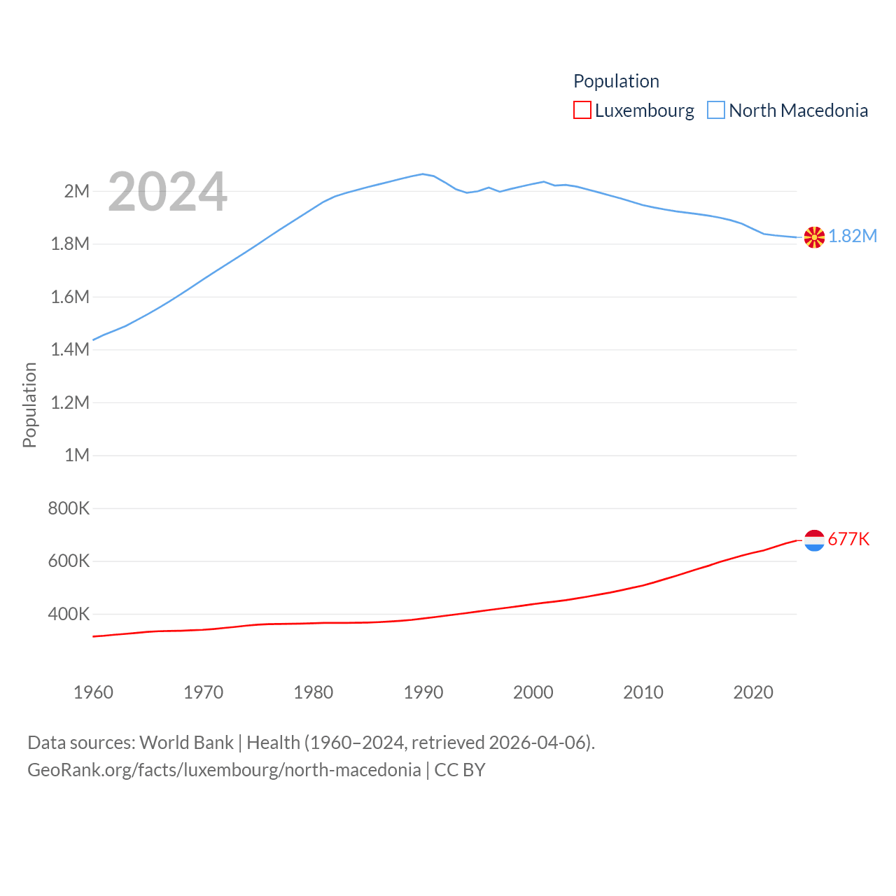 Luxembourg has a population of 677K (ranked 164/197), compared with 1.82M in North Macedonia (ranked 150/197). Luxembourg's land area is 994 sq mi versus 9,737 sq mi for North Macedonia (ranked 169th vs. 145th).