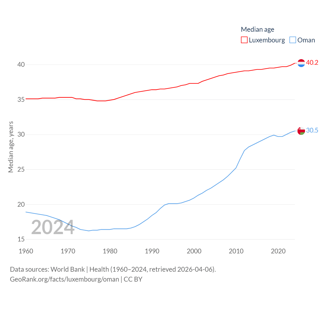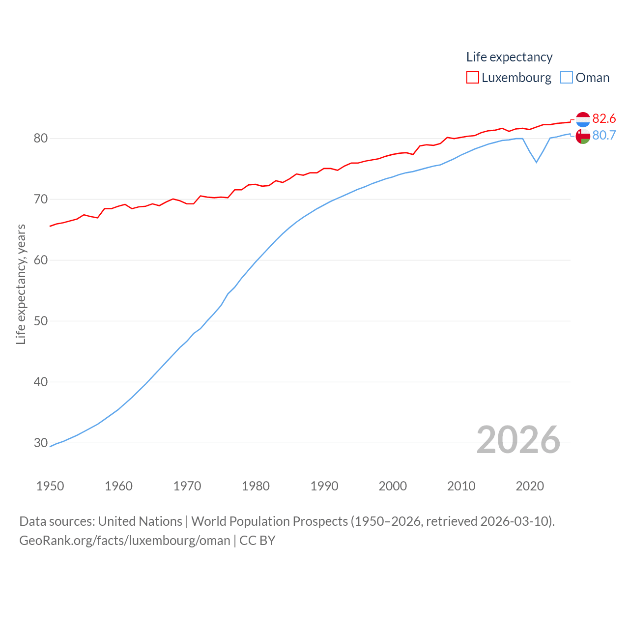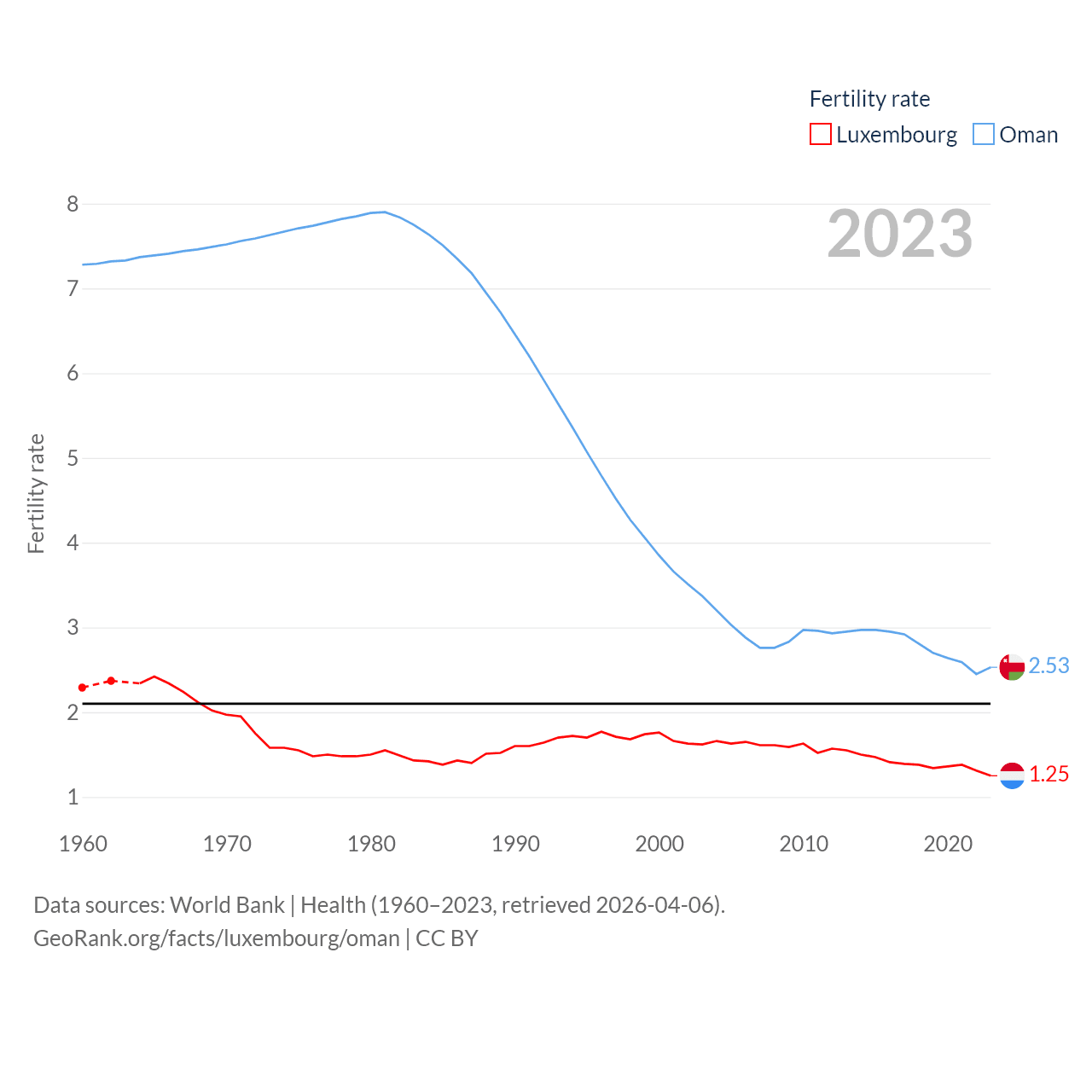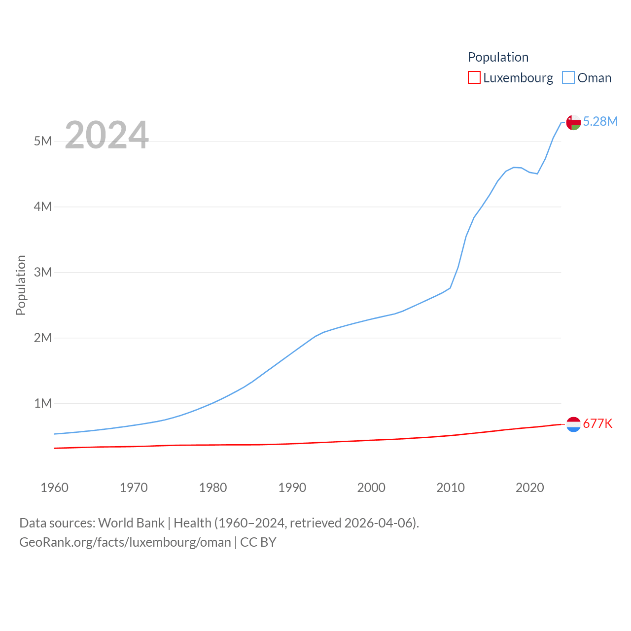 Luxembourg has a population of 677K (ranked 164/197), compared with 5.28M in Oman (ranked 124/197). Luxembourg's land area is 994 sq mi versus 119,499 sq mi for Oman (ranked 169th vs. 68th).