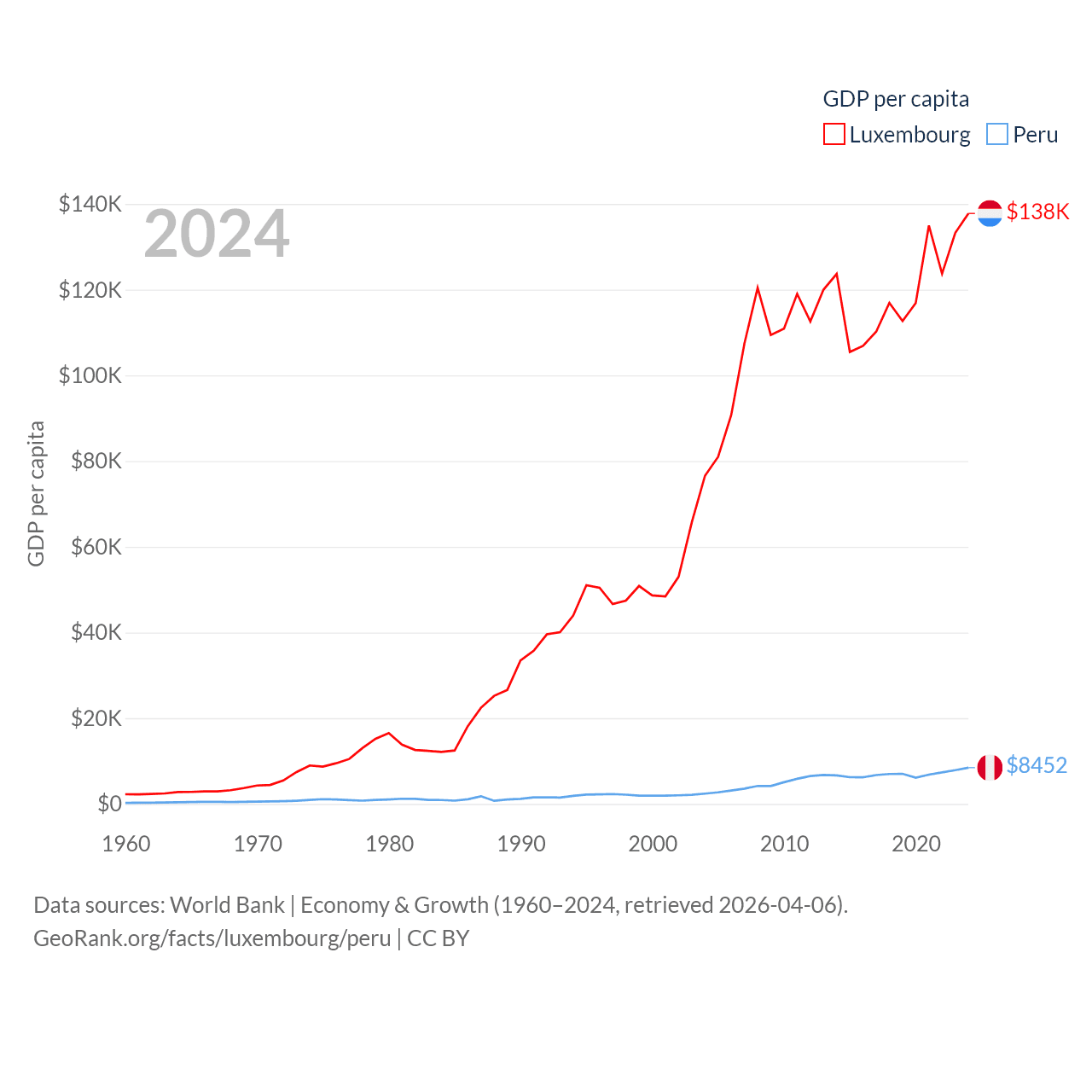 By GDP, Luxembourg ranks 74/197 ($93.3B) and Peru ranks 49/197 ($289B). By GDP per capita, Luxembourg ranks 3/197 ($137,782), while Peru ranks 91/197 ($8,452).