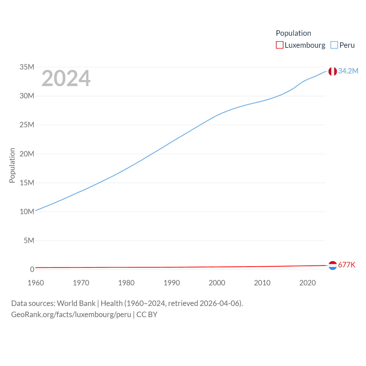 Luxembourg has a population of 677K (ranked 164/197), compared with 34.2M in Peru (ranked 48/197). Luxembourg's land area is 994 sq mi versus 494,211 sq mi for Peru (ranked 169th vs. 19th).