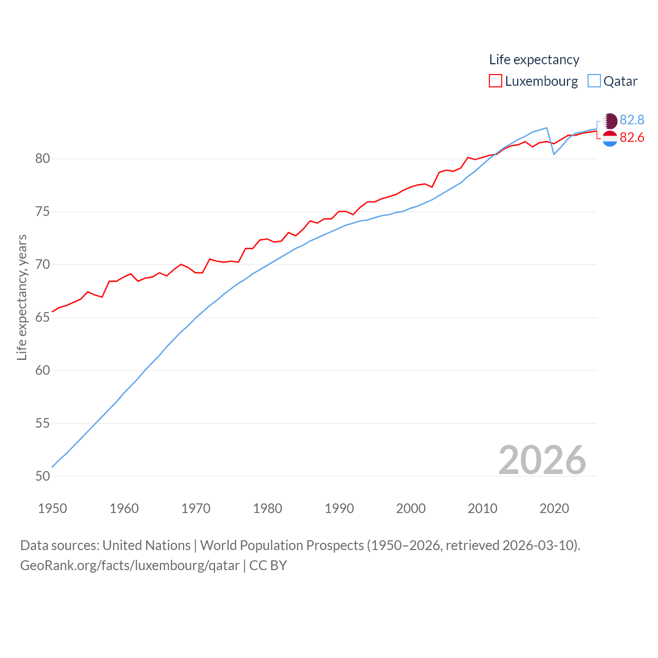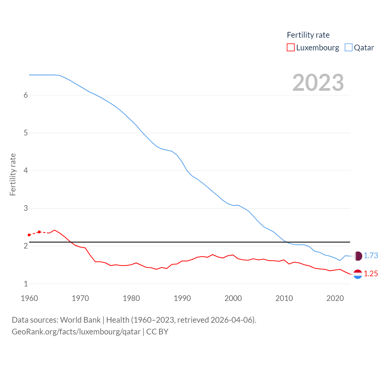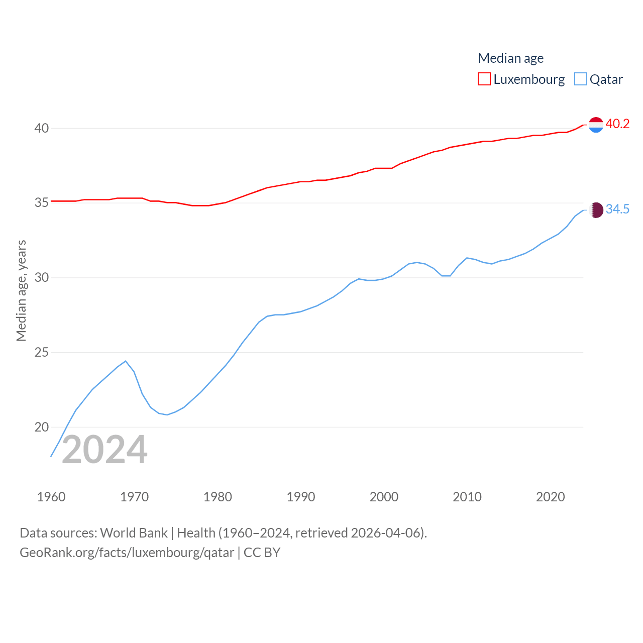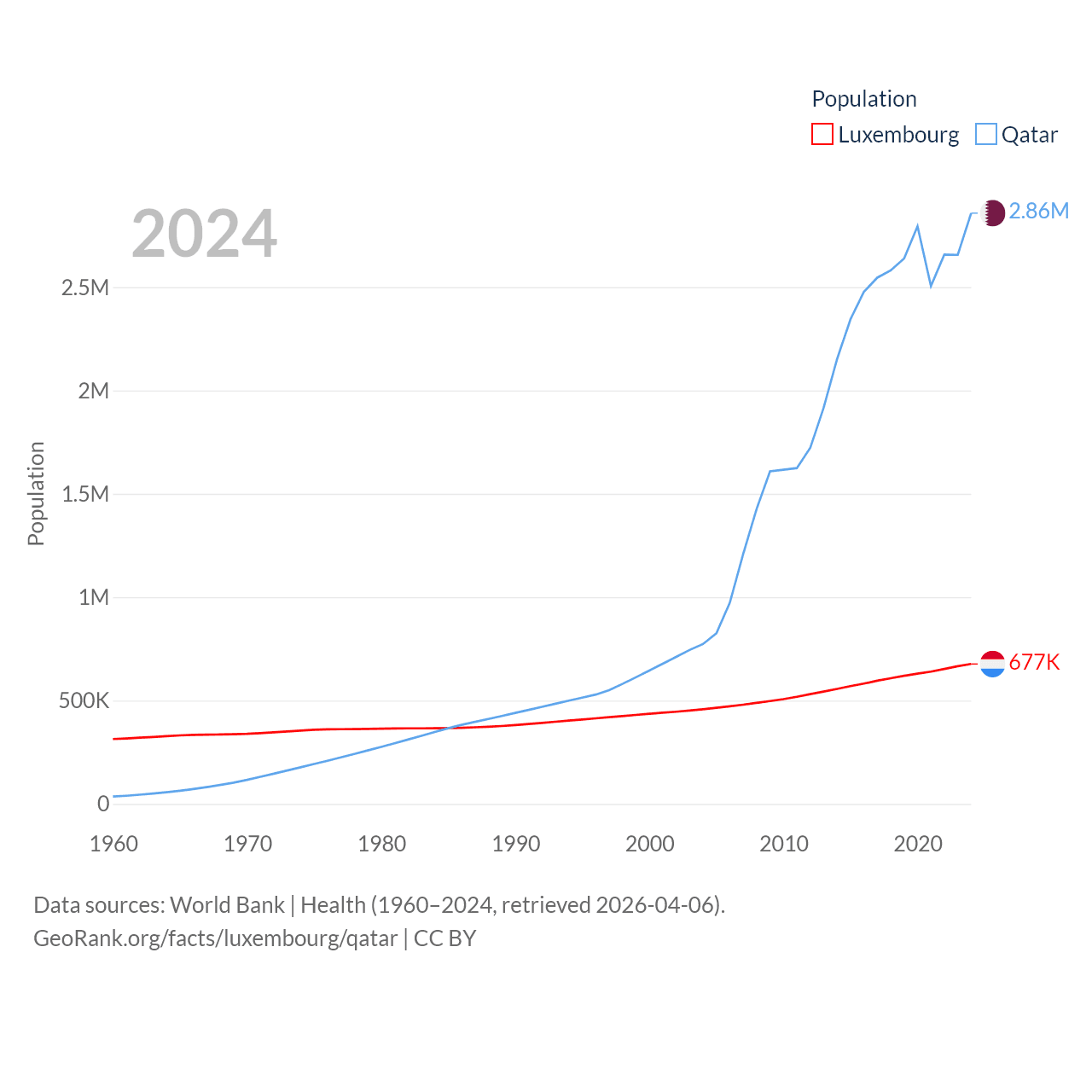 Luxembourg has a population of 677K (ranked 164/197), compared with 2.86M in Qatar (ranked 138/197). Luxembourg's land area is 994 sq mi versus 4,436 sq mi for Qatar (ranked 169th vs. 158th).