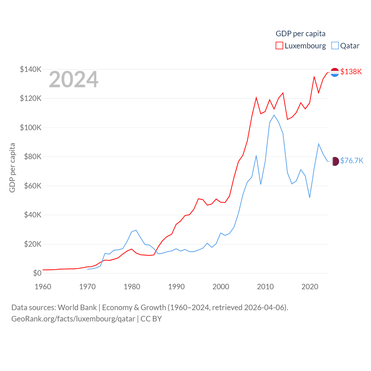 By GDP, Luxembourg ranks 74/197 ($93.3B) and Qatar ranks 56/197 ($219B). By GDP per capita, Luxembourg ranks 3/197 ($137,782), while Qatar ranks 11/197 ($76,689).