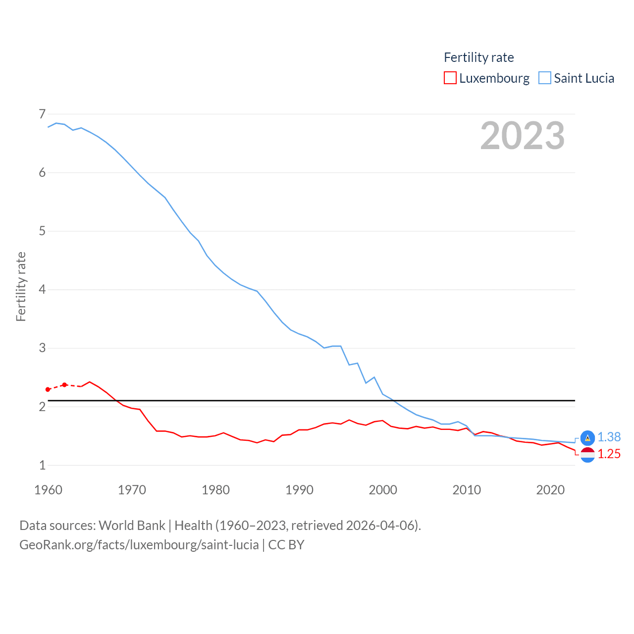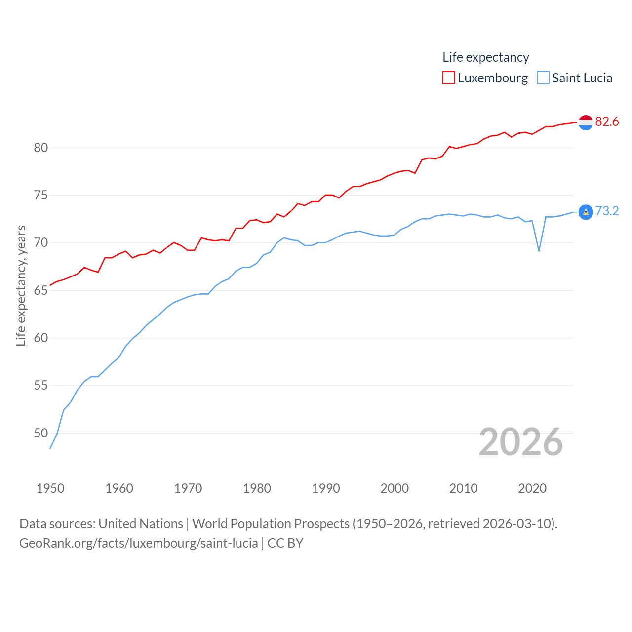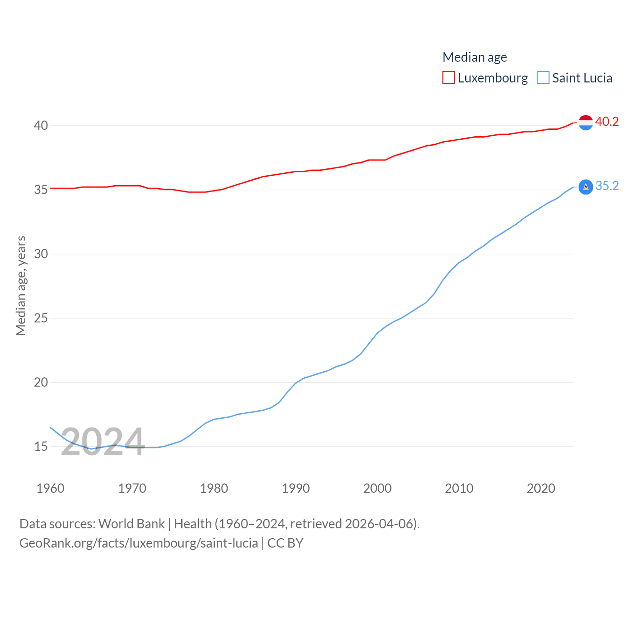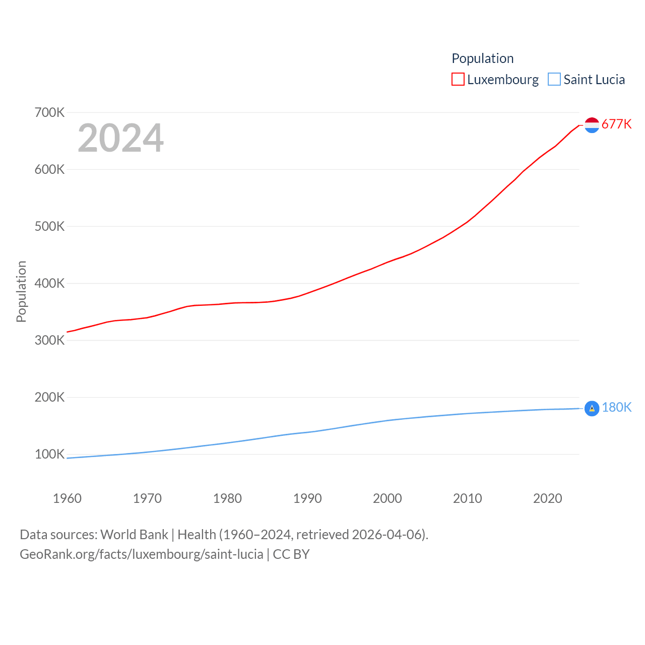 Luxembourg has a population of 677K (ranked 164/197), compared with 180K in Saint Lucia (ranked 178/197). Luxembourg's land area is 994 sq mi versus 235.5 sq mi for Saint Lucia (ranked 169th vs. 178th).