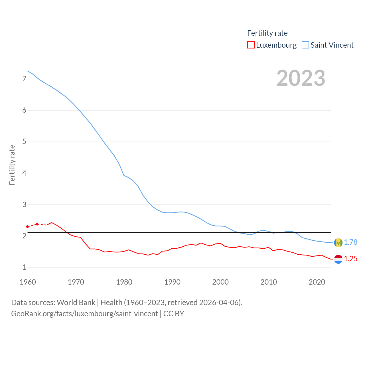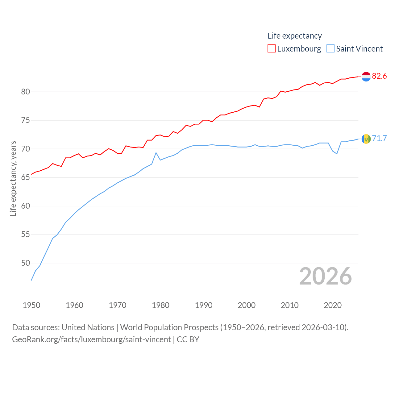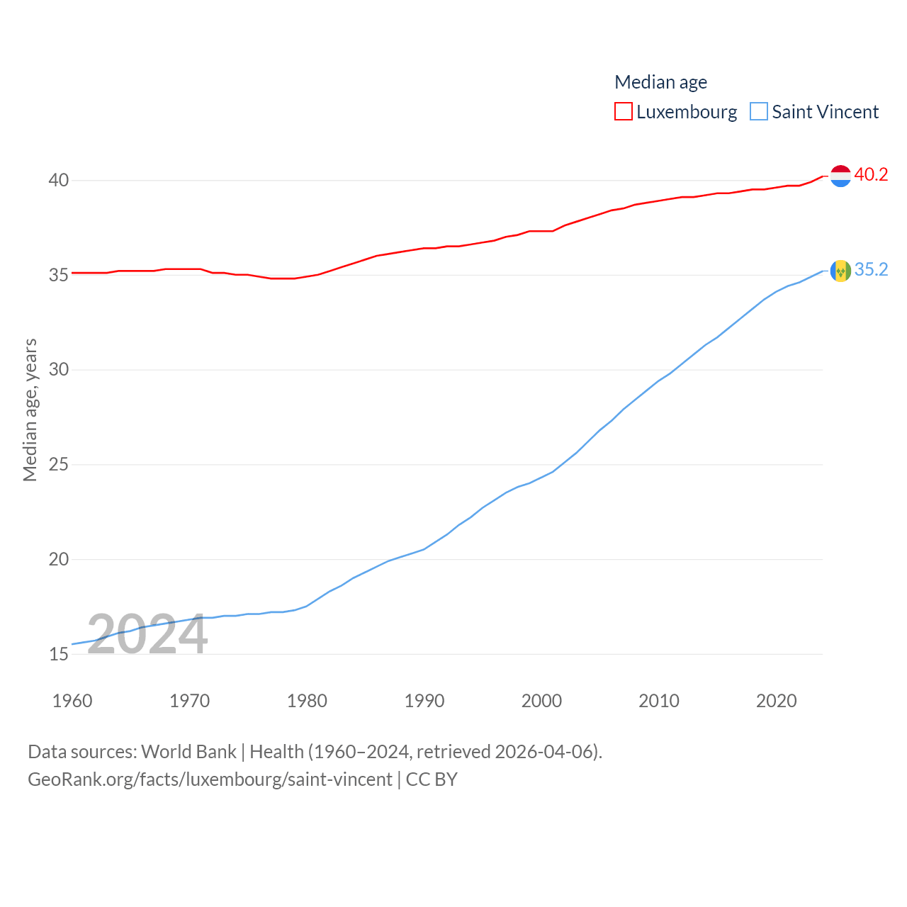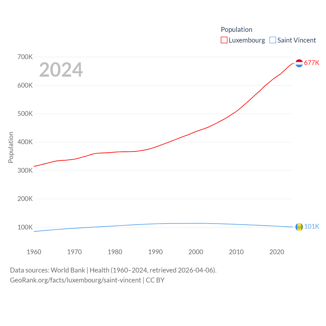 Luxembourg has a population of 677K (ranked 164/197), compared with 101K in Saint Vincent (ranked 184/197). Luxembourg's land area is 994 sq mi versus 150.6 sq mi for Saint Vincent (ranked 169th vs. 185th).