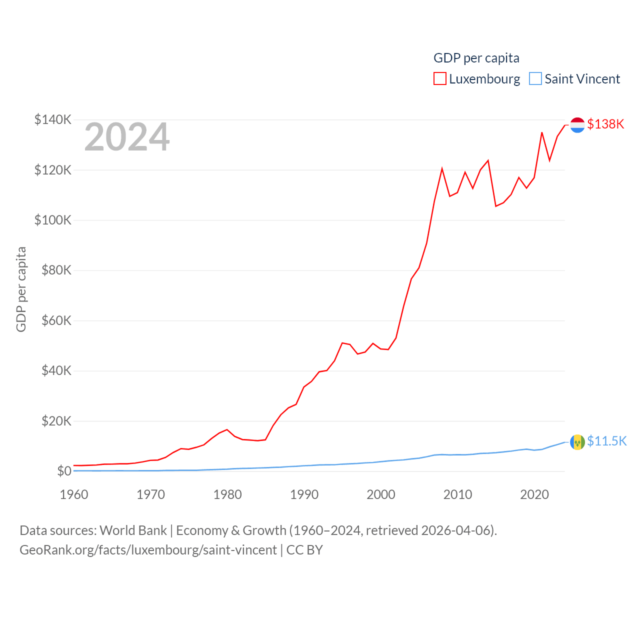 By GDP, Luxembourg ranks 74/197 ($93.3B) and Saint Vincent ranks 186/197 ($1.16B). By GDP per capita, Luxembourg ranks 3/197 ($137,782), while Saint Vincent ranks 81/197 ($11,501).