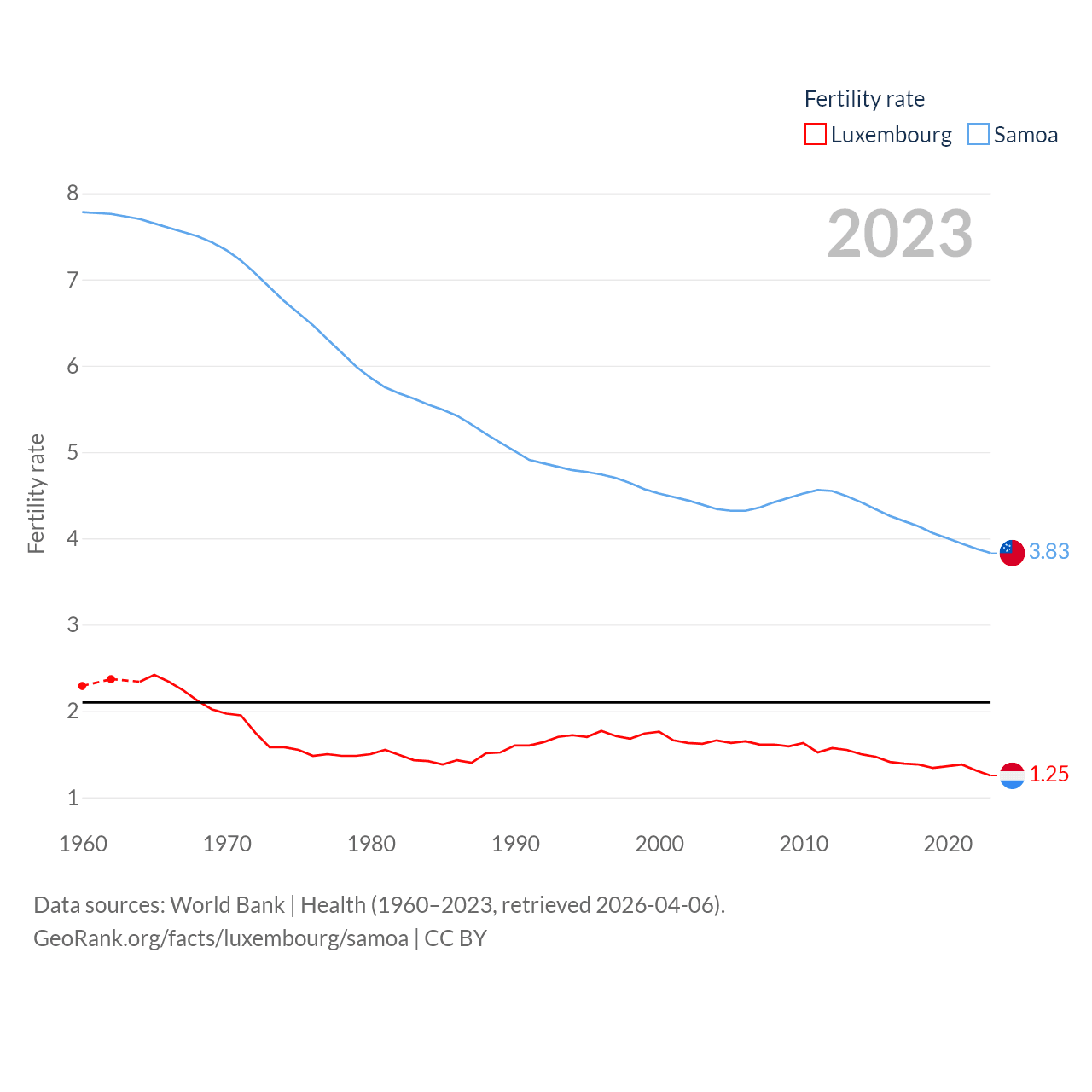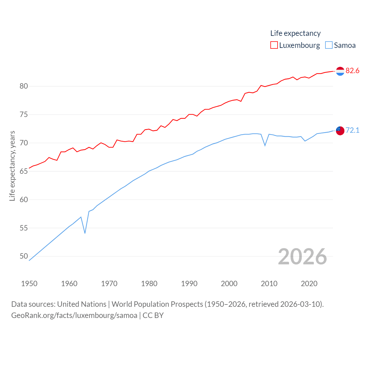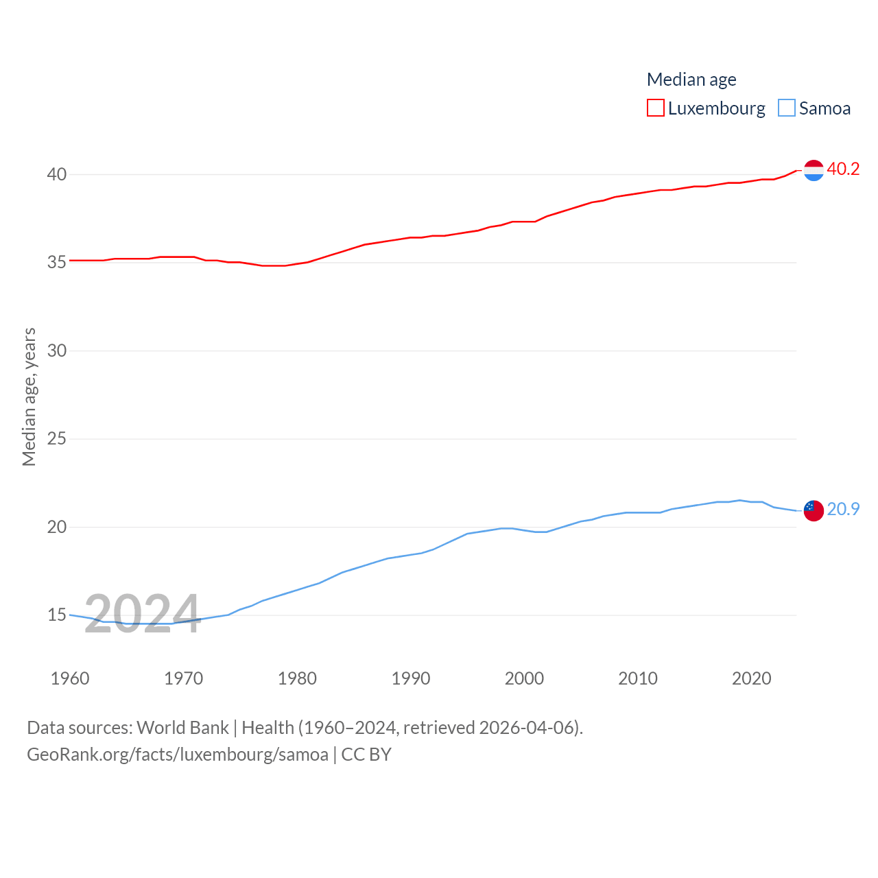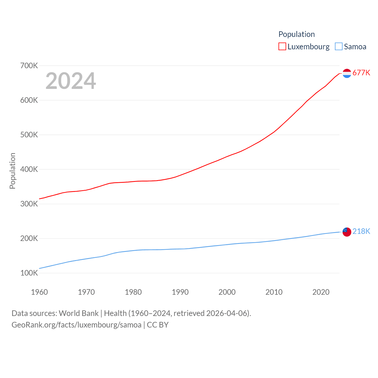 Luxembourg has a population of 677K (ranked 164/197), compared with 218K in Samoa (ranked 177/197). Luxembourg's land area is 994 sq mi versus 1,073 sq mi for Samoa (ranked 169th vs. 168th).