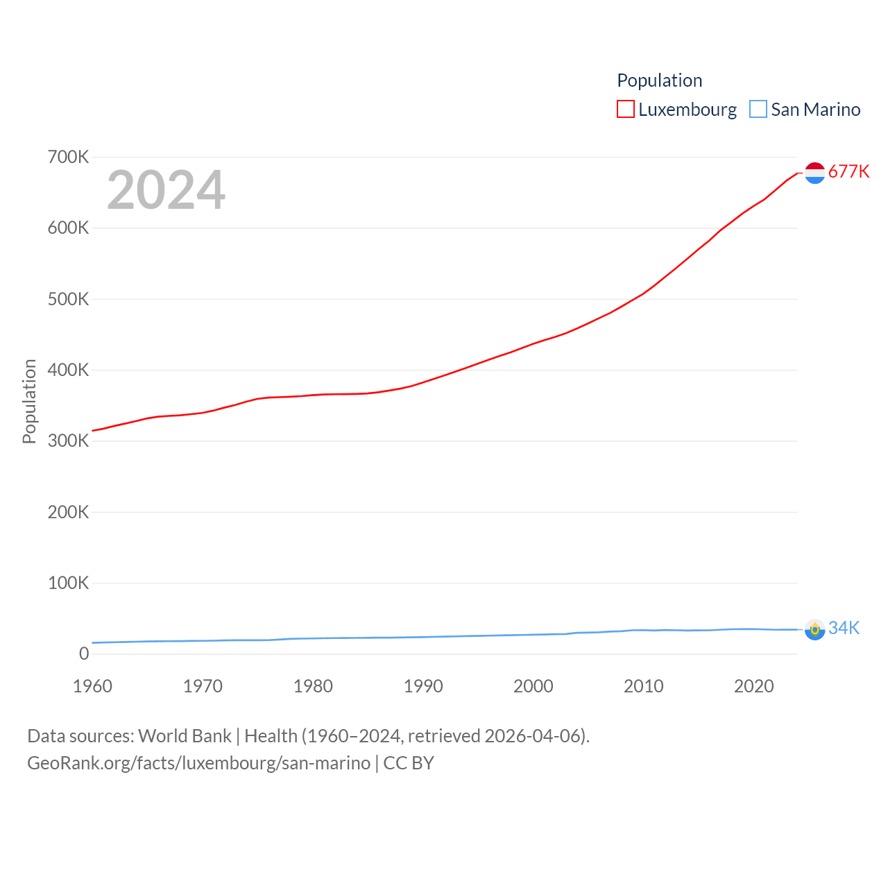 Luxembourg has a population of 677K (ranked 164/197), compared with 34K in San Marino (ranked 193/197). Luxembourg's land area is 994 sq mi versus 23.2 sq mi for San Marino (ranked 169th vs. 193rd).