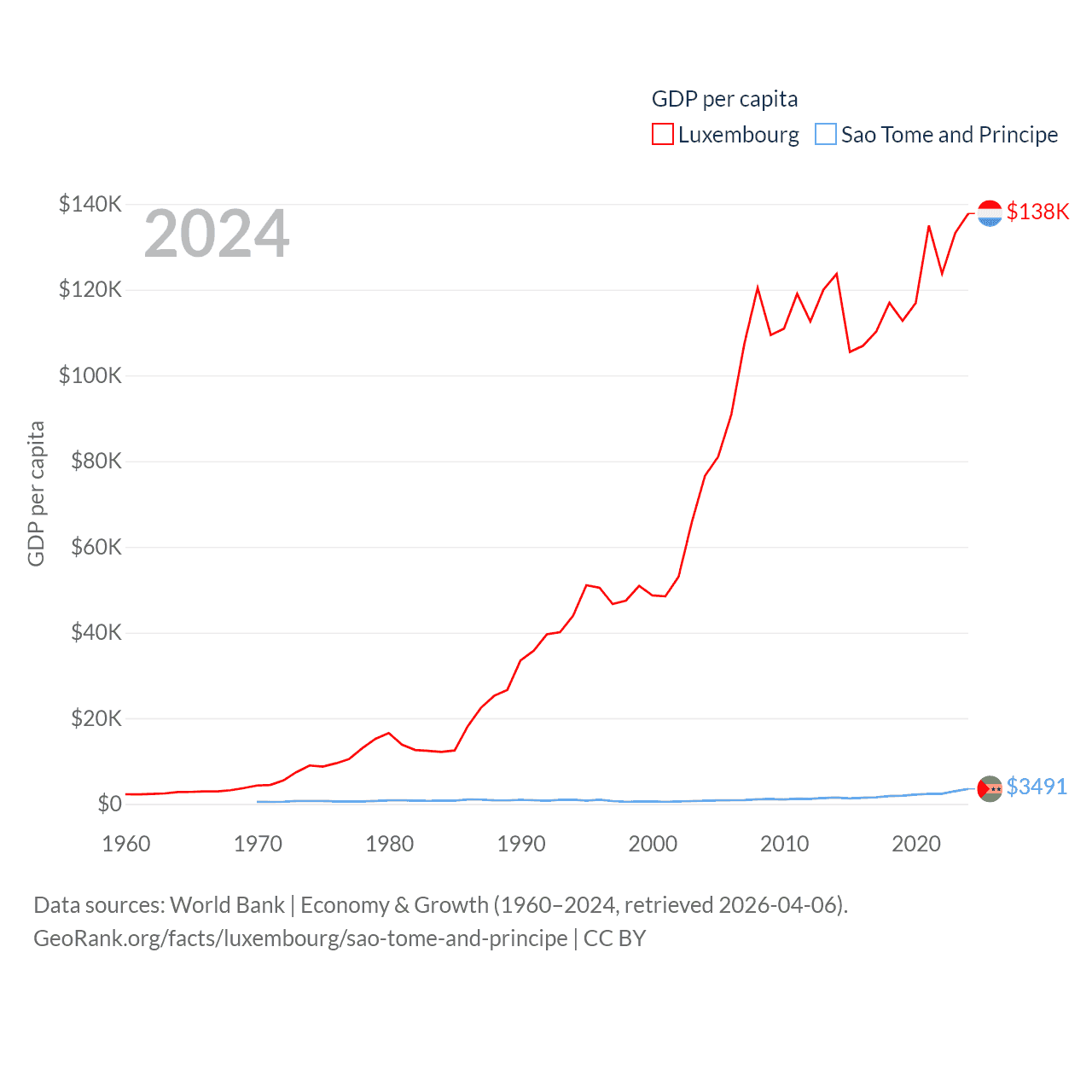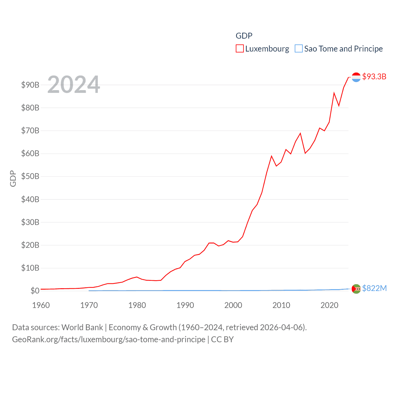By GDP, Luxembourg ranks 74/197 ($93.3B) and Sao Tome and Principe ranks 189/197 ($822M). By GDP per capita, Luxembourg ranks 3/197 ($137,782), while Sao Tome and Principe ranks 134/197 ($3,491).