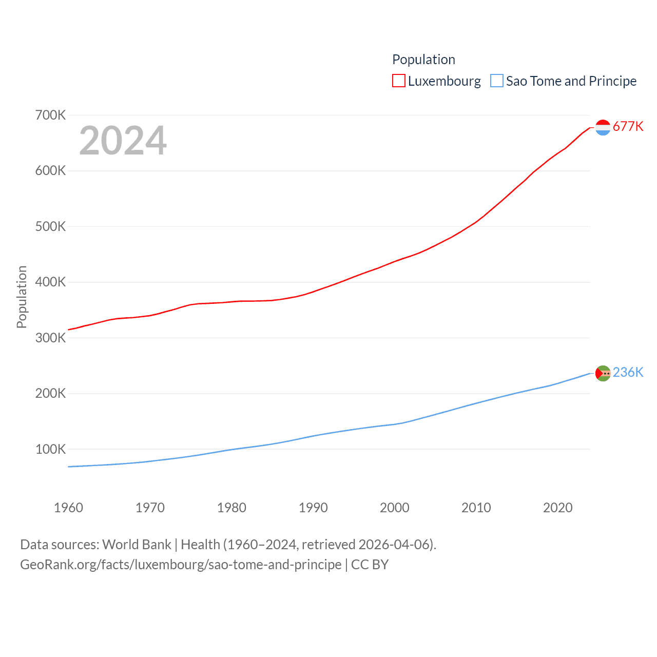 Luxembourg has a population of 677K (ranked 164/197), compared with 236K in Sao Tome and Principe (ranked 176/197). Luxembourg's land area is 994 sq mi versus 371 sq mi for Sao Tome and Principe (ranked 169th vs. 172nd).