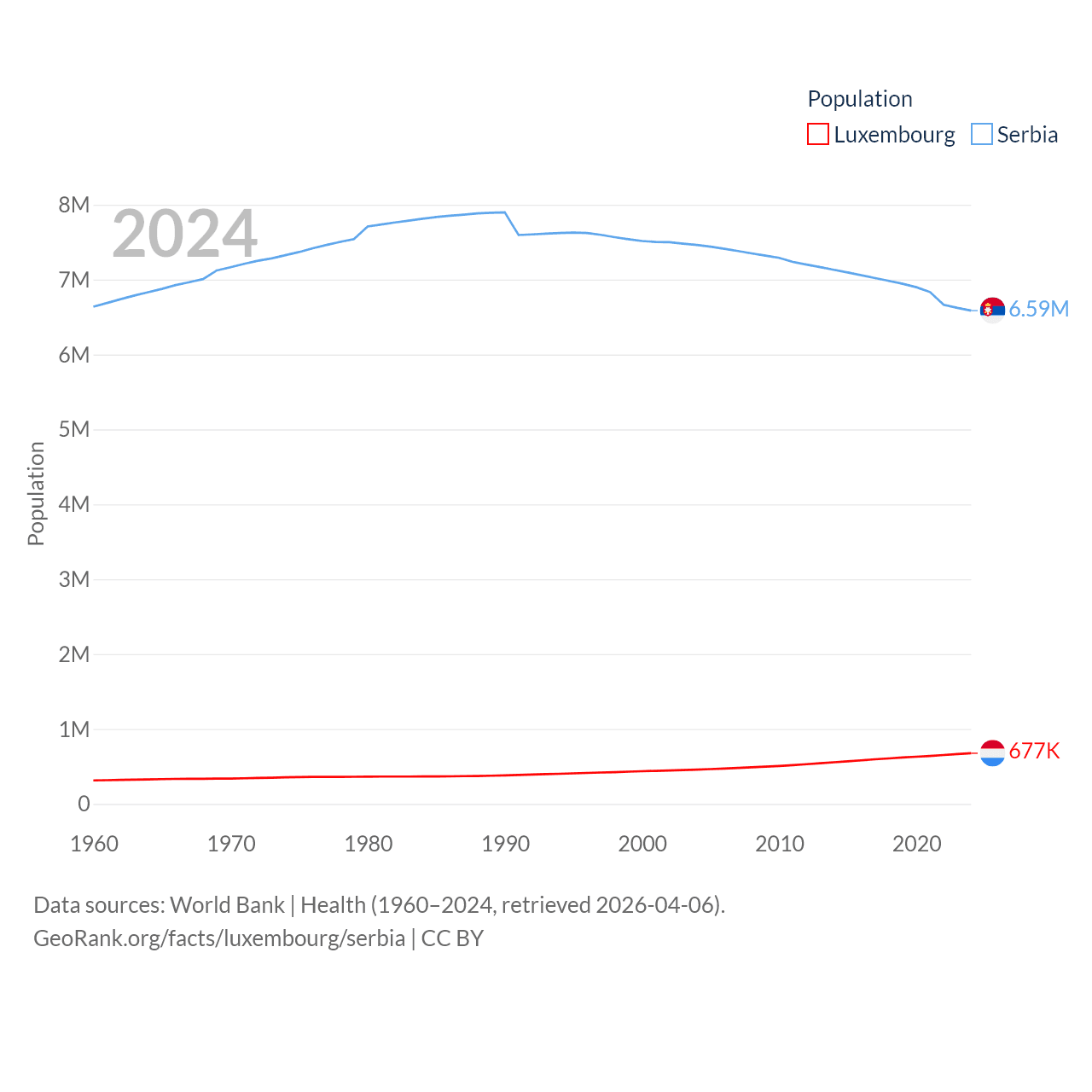 Luxembourg has a population of 677K (ranked 164/197), compared with 6.59M in Serbia (ranked 109/197). Luxembourg's land area is 994 sq mi versus 32,467 sq mi for Serbia (ranked 169th vs. 111th).