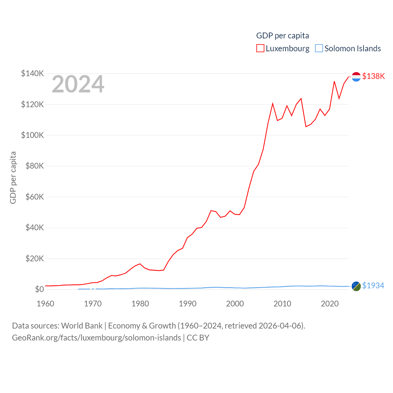 By GDP, Luxembourg ranks 74/197 ($93.3B) and The Solomon Islands ranks 182/197 ($1.58B). By GDP per capita, Luxembourg ranks 3/197 ($137,782), while The Solomon Islands ranks 157/197 ($1,934).