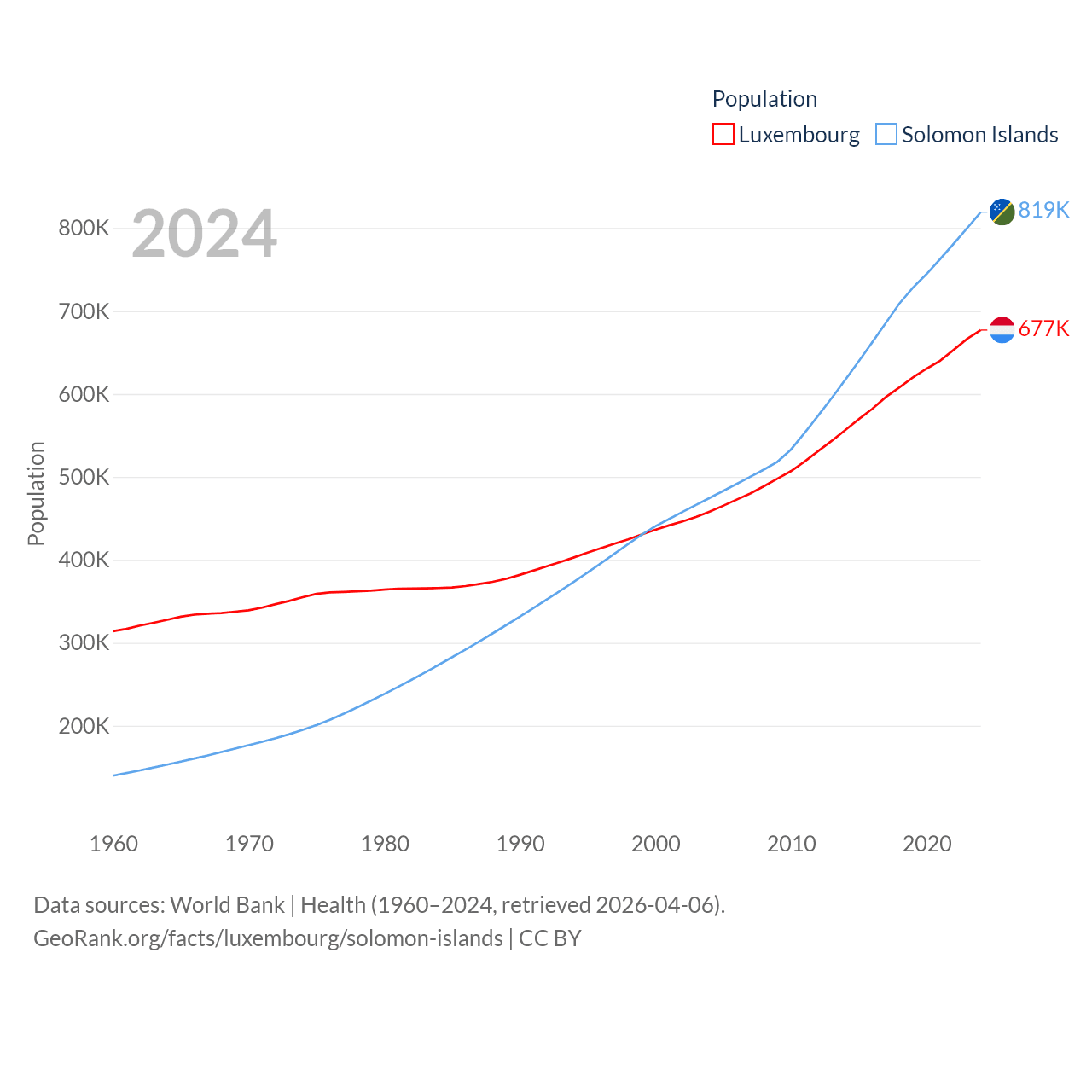 Luxembourg has a population of 677K (ranked 164/197), compared with 819K in The Solomon Islands (ranked 162/197). Luxembourg's land area is 994 sq mi versus 10,807 sq mi for The Solomon Islands (ranked 169th vs. 141st).