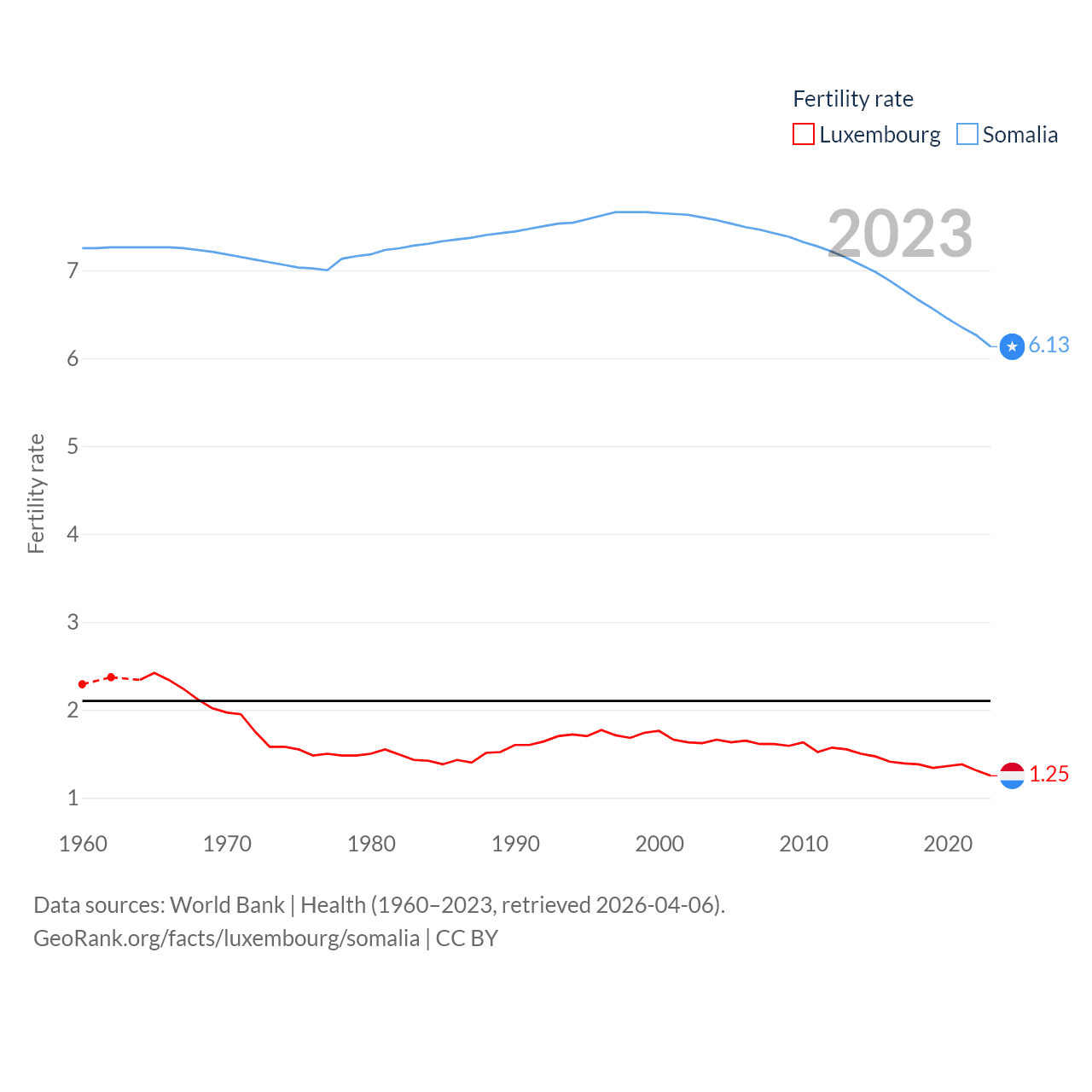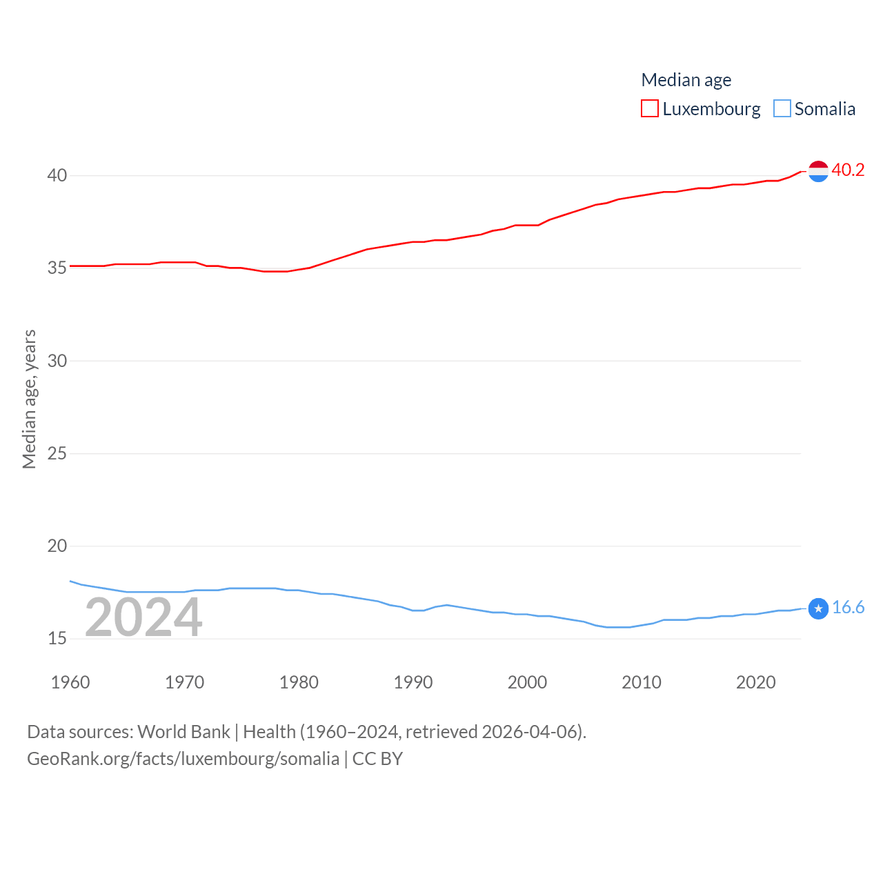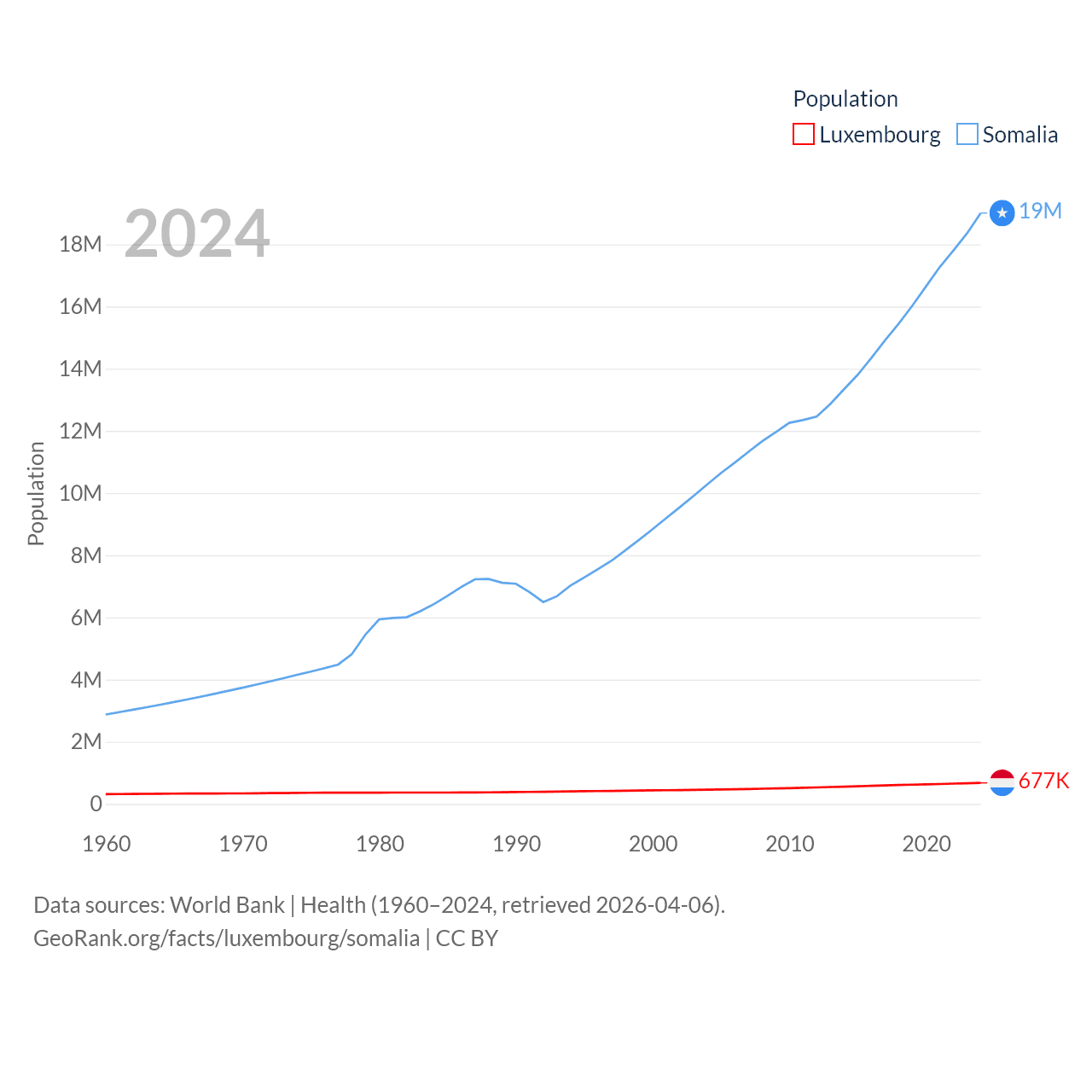 Luxembourg has a population of 677K (ranked 164/197), compared with 19M in Somalia (ranked 68/197). Luxembourg's land area is 994 sq mi versus 242,217 sq mi for Somalia (ranked 169th vs. 42nd).